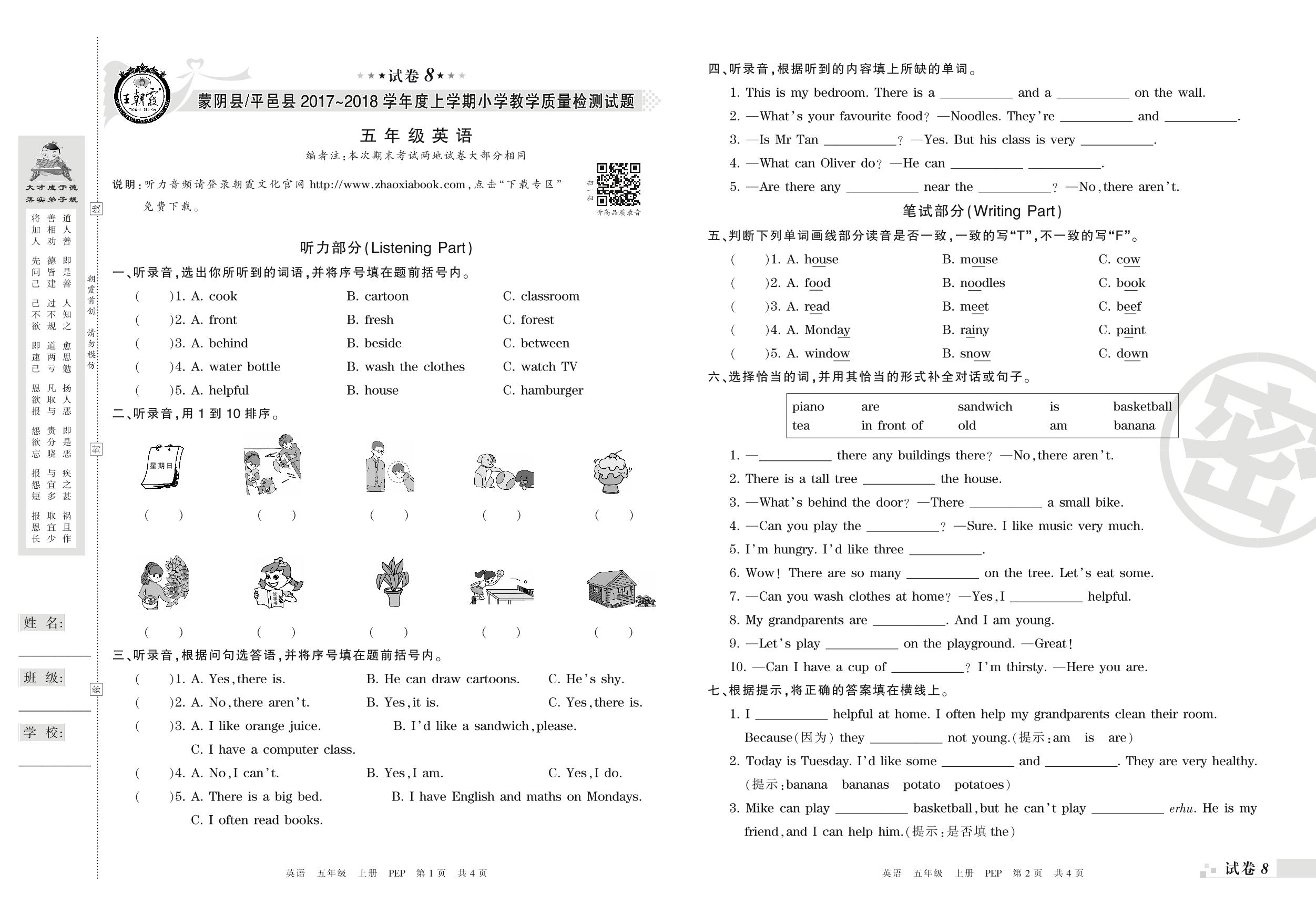 2017-2018学年第一学期临沂市蒙阴县、平邑县五年级英语试卷(PEP版)【8】