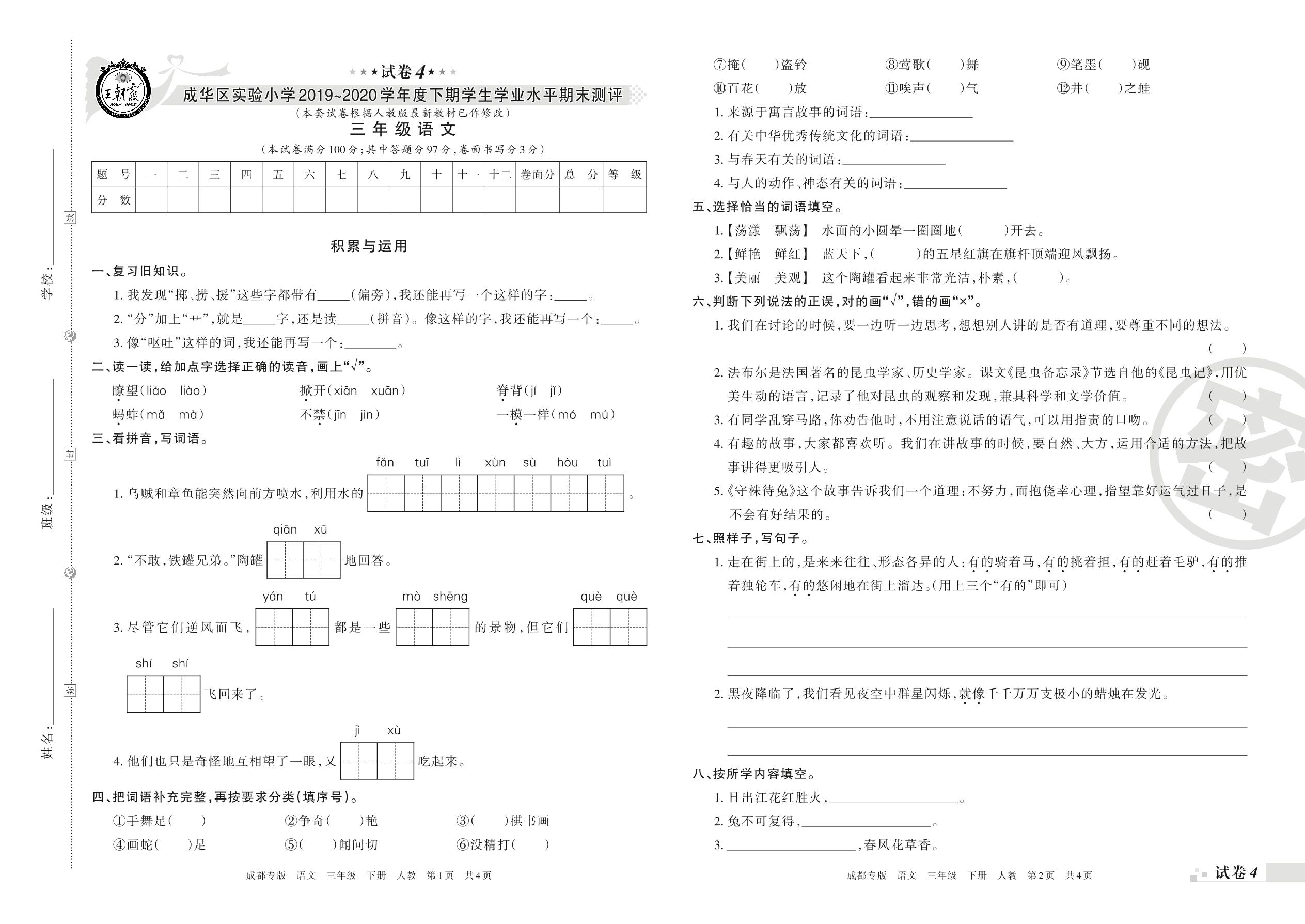 2019-2020学年第二学期成都市成华区实验小学三年级语文试卷(人教版)【4】