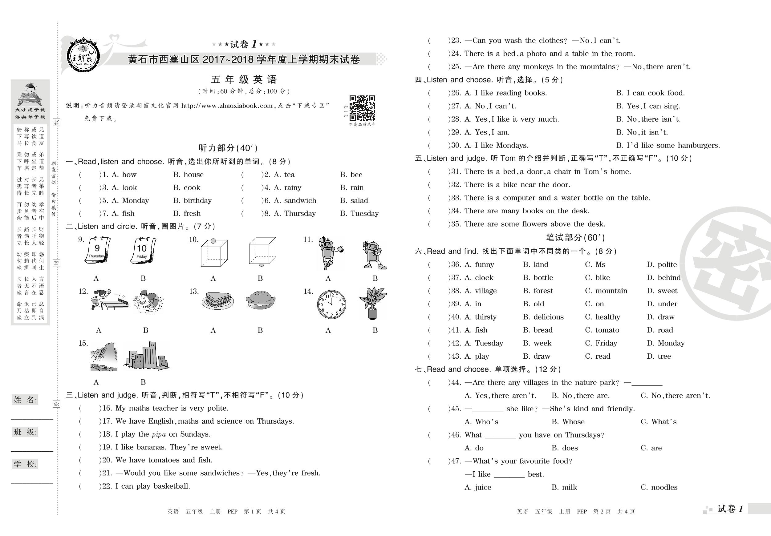 2017-2018学年第一学期黄石市西塞山区五年级英语试卷(PEP版)【1】