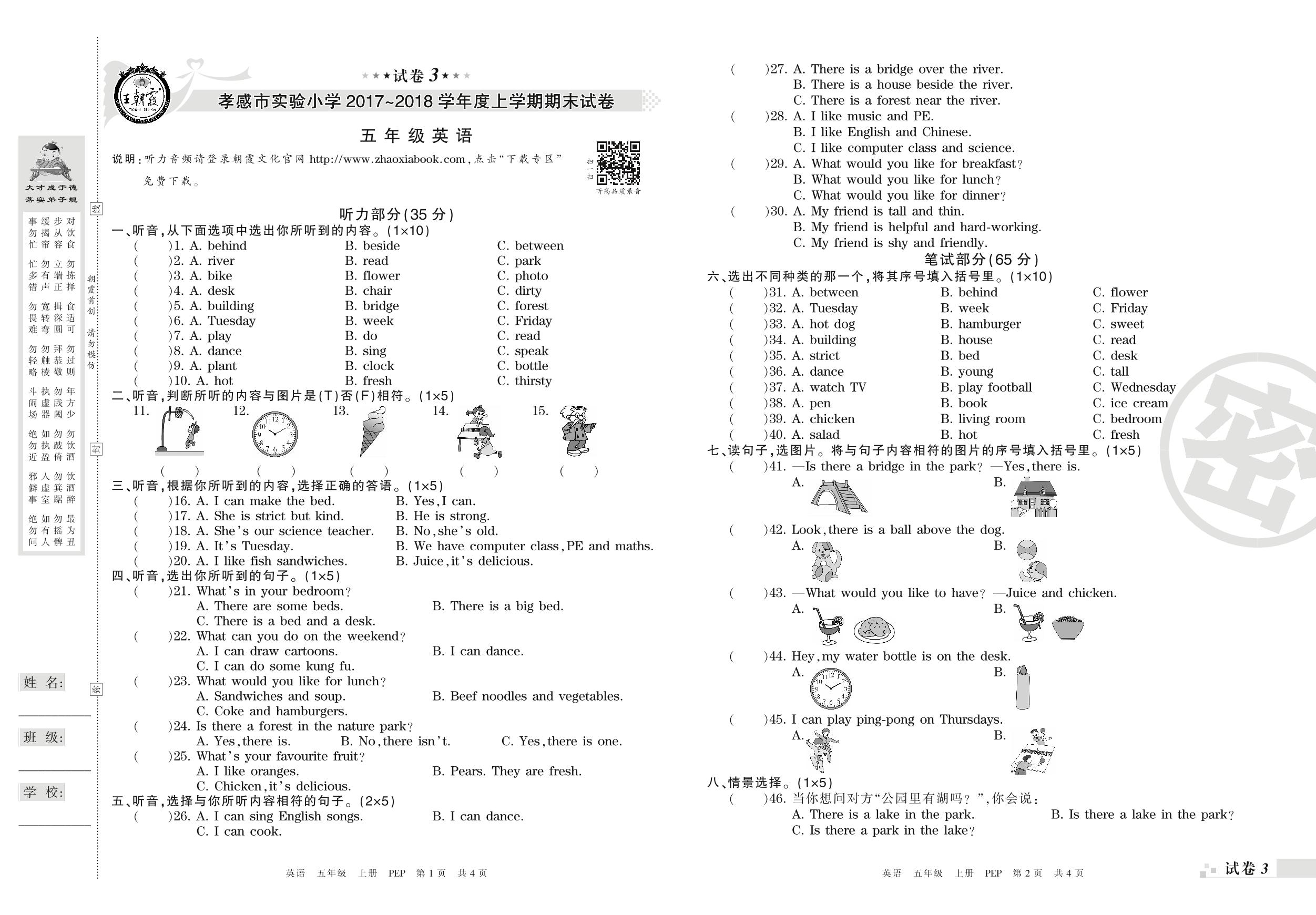 2017-2018学年第一学期孝感市实验小学五年级英语试卷(PEP版)【3】