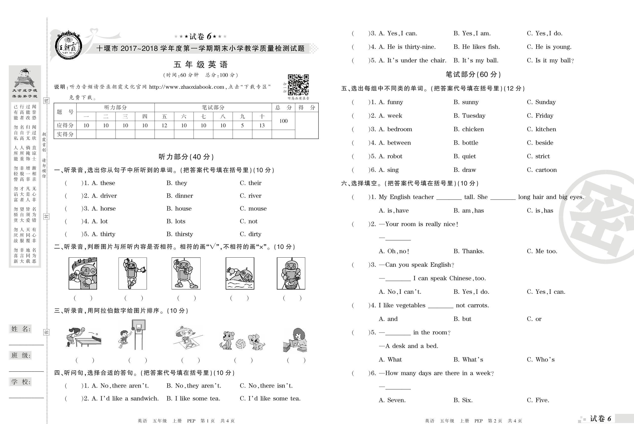 2017-2018学年第一学期十堰市五年级英语试卷(PEP版)【6】