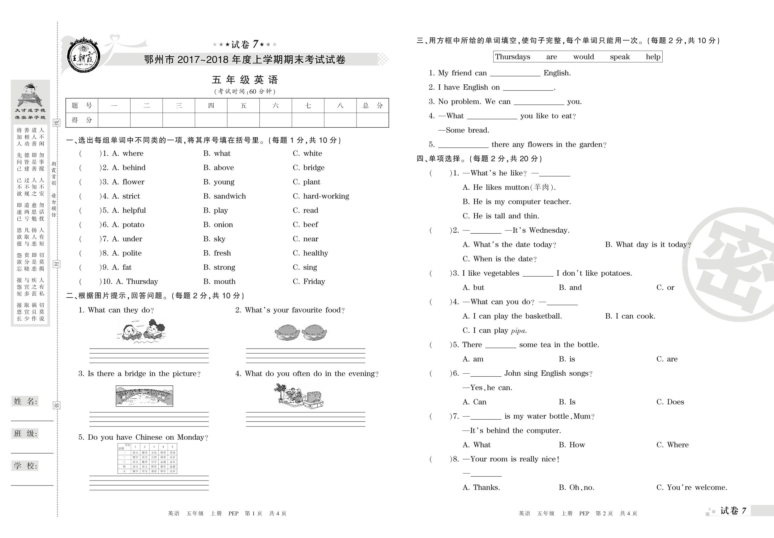 2017-2018学年第一学期鄂州市五年级英语试卷(PEP版)【7】