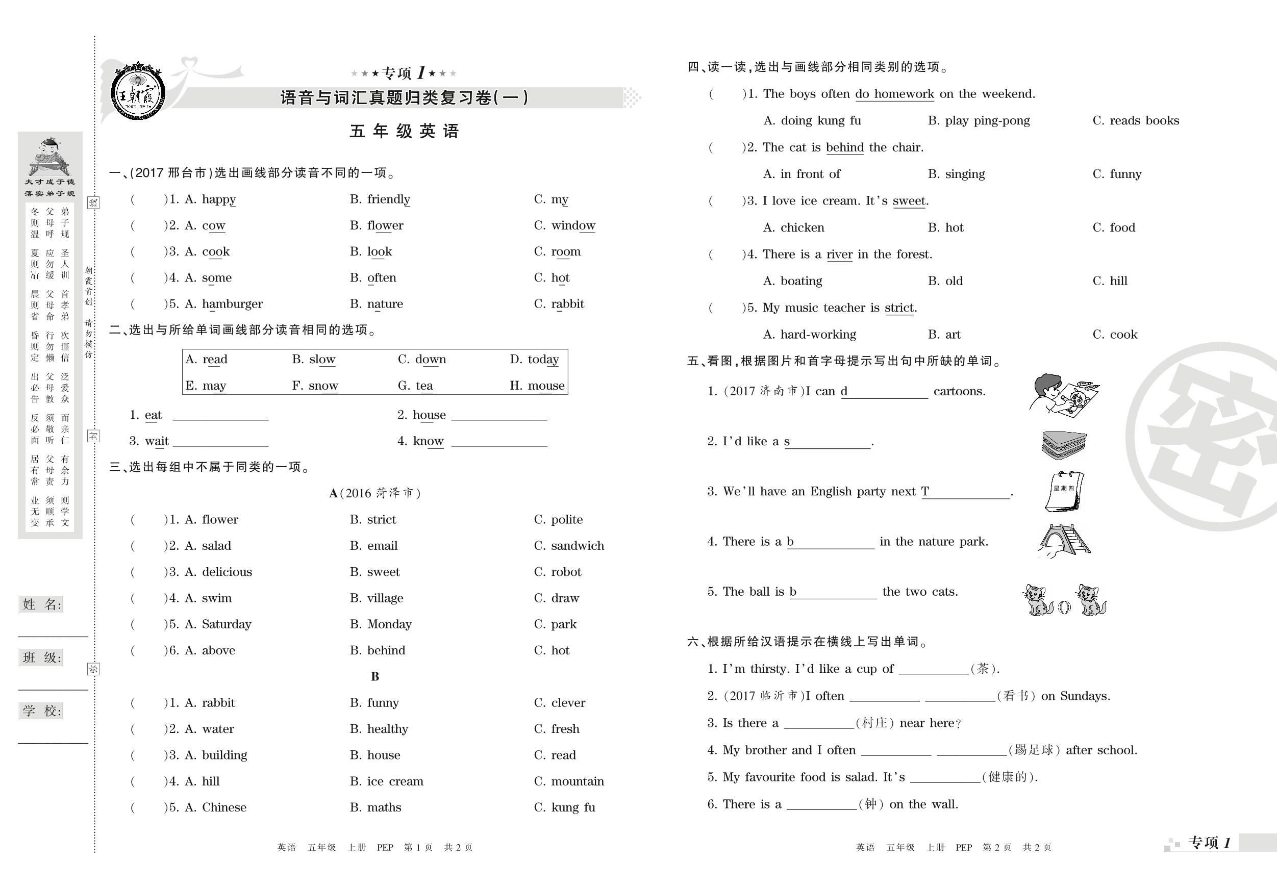 王朝霞期末专项卷——语音与词汇真题归类复习五年级上册英语(PEP版)【0】