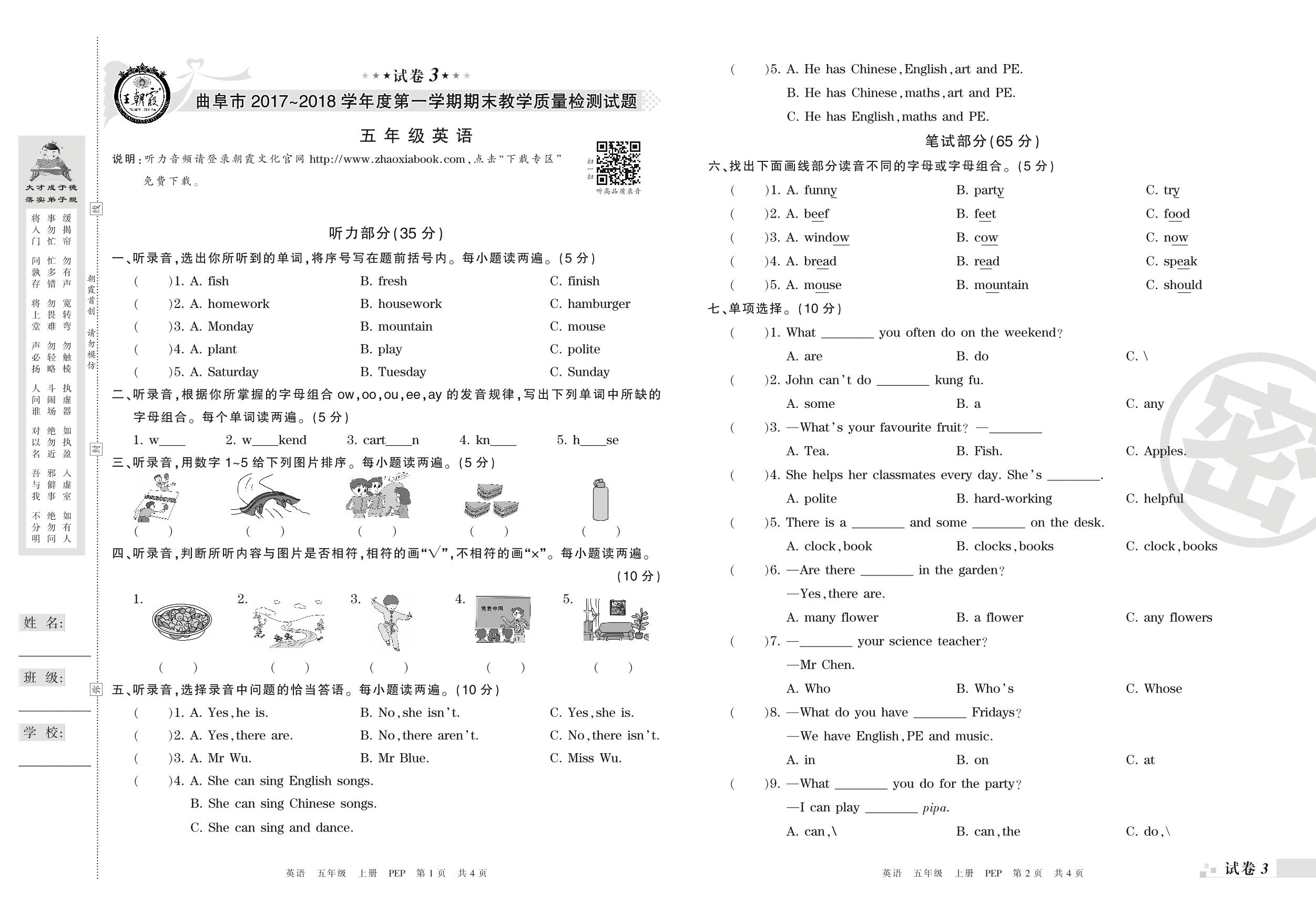 2017-2018学年第一学期曲阜市五年级英语试卷(PEP版)【3】