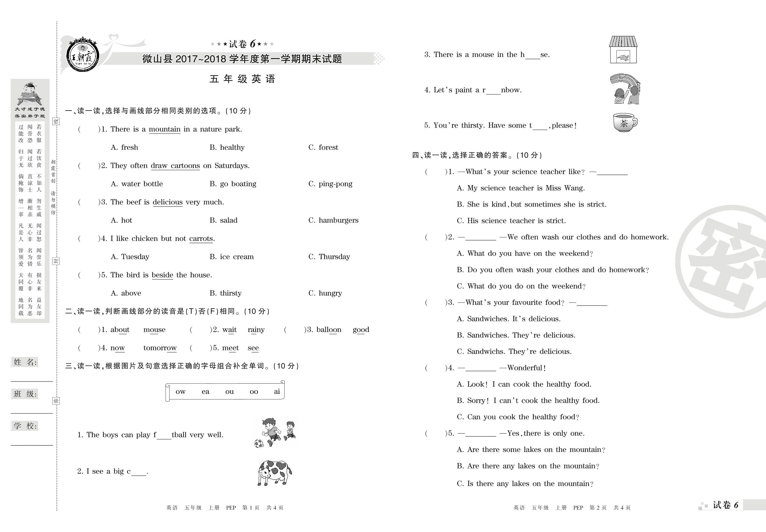 2017-2018学年第一学期济宁市微山县五年级英语试卷(PEP版)【6】