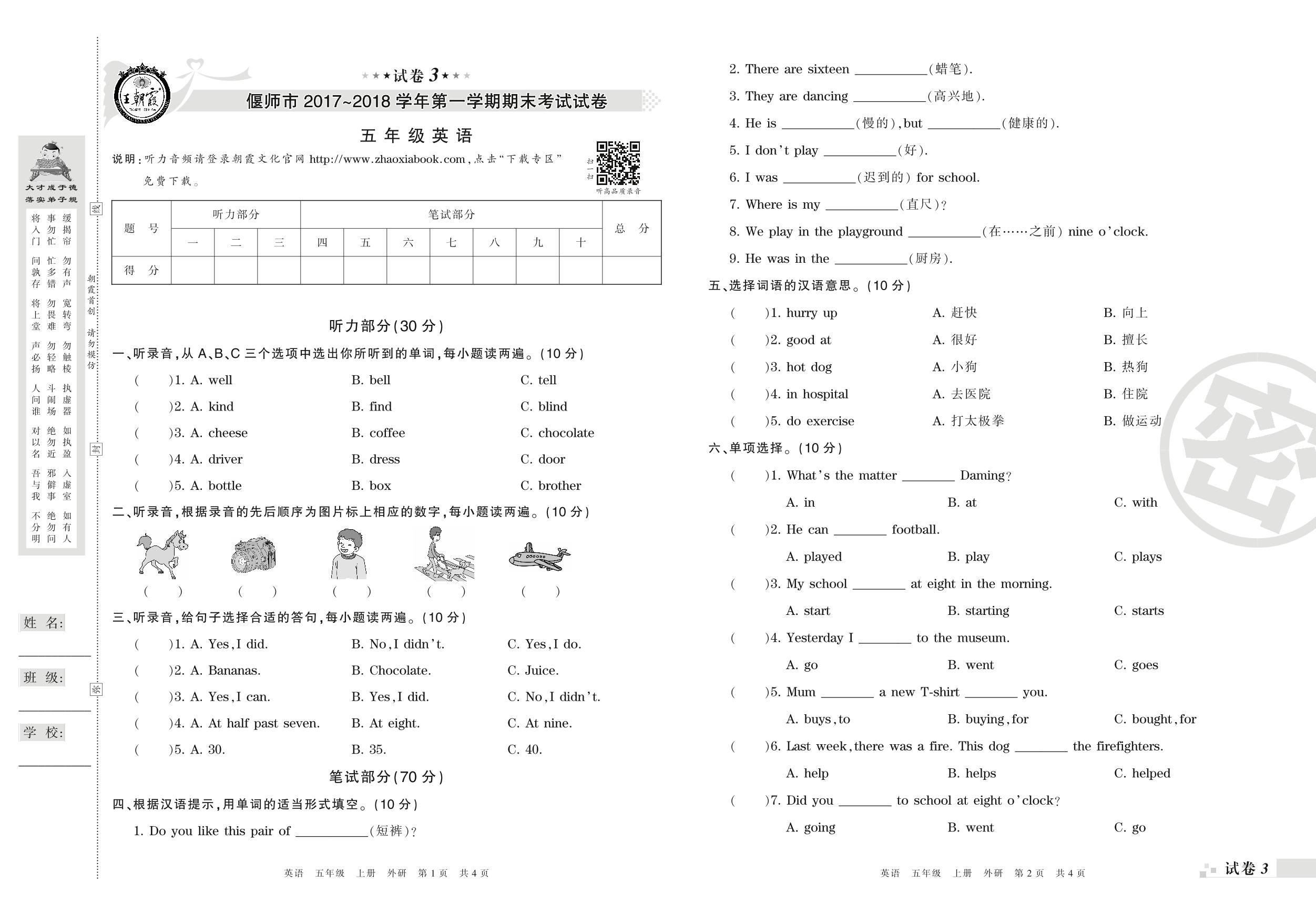 2017-2018学年第一学期偃师市五年级英语试卷(外研版)【3】