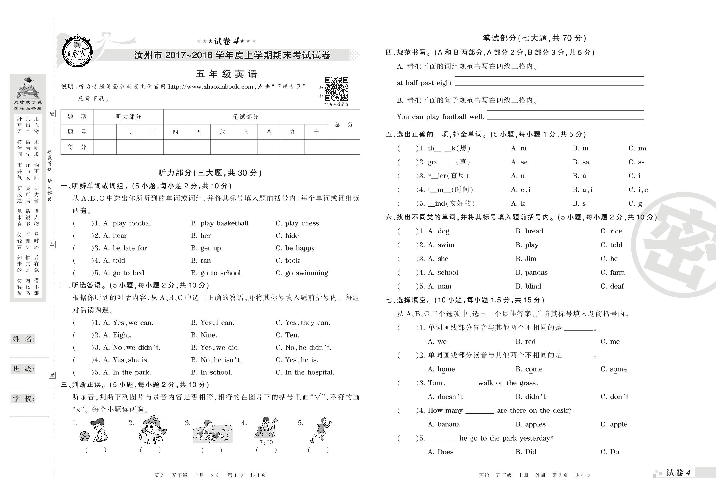 2017-2018学年第一学期汝州市五年级英语试卷(外研版)【4】