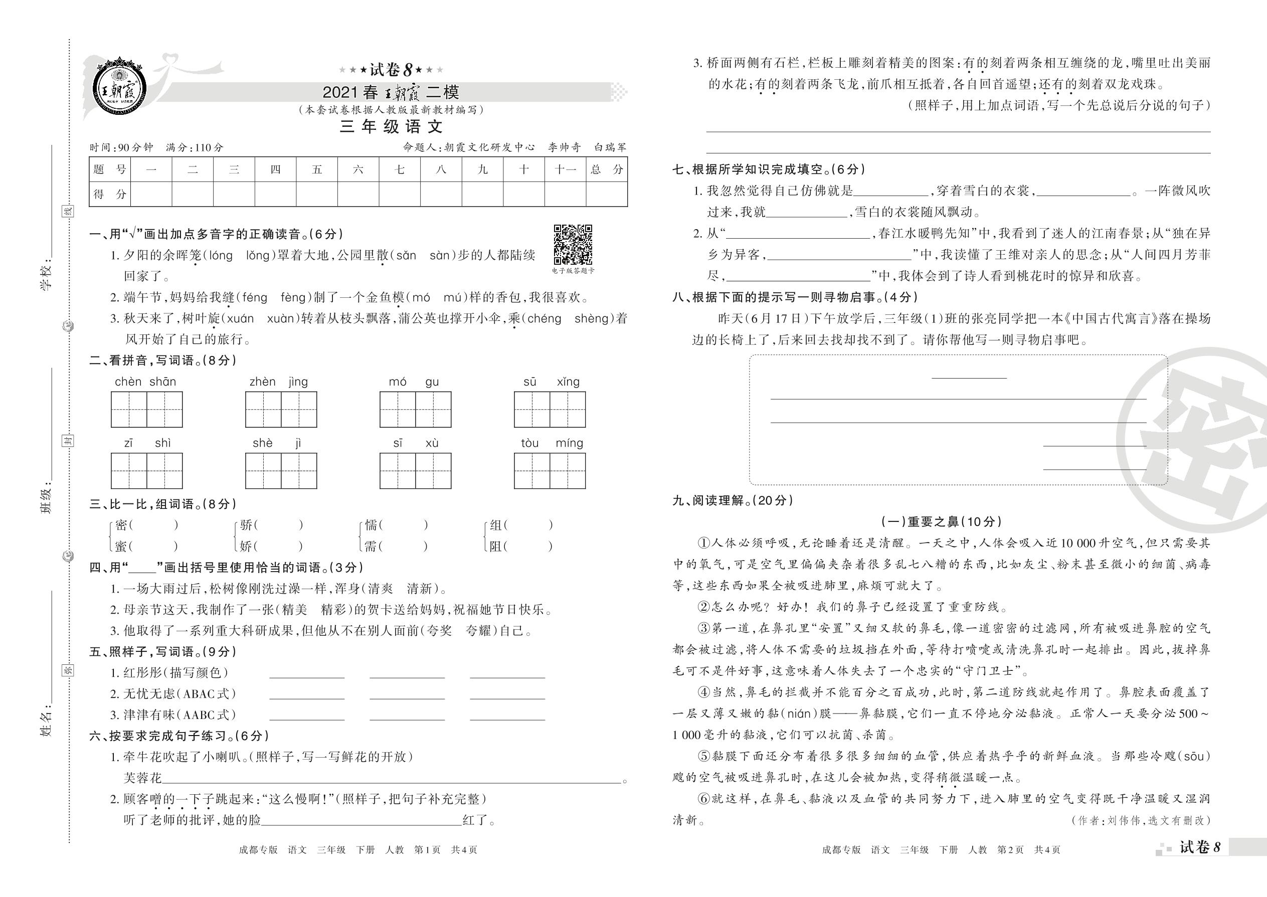 王朝霞期末模拟卷三年级下册语文(人教版)_R21080183249【8】