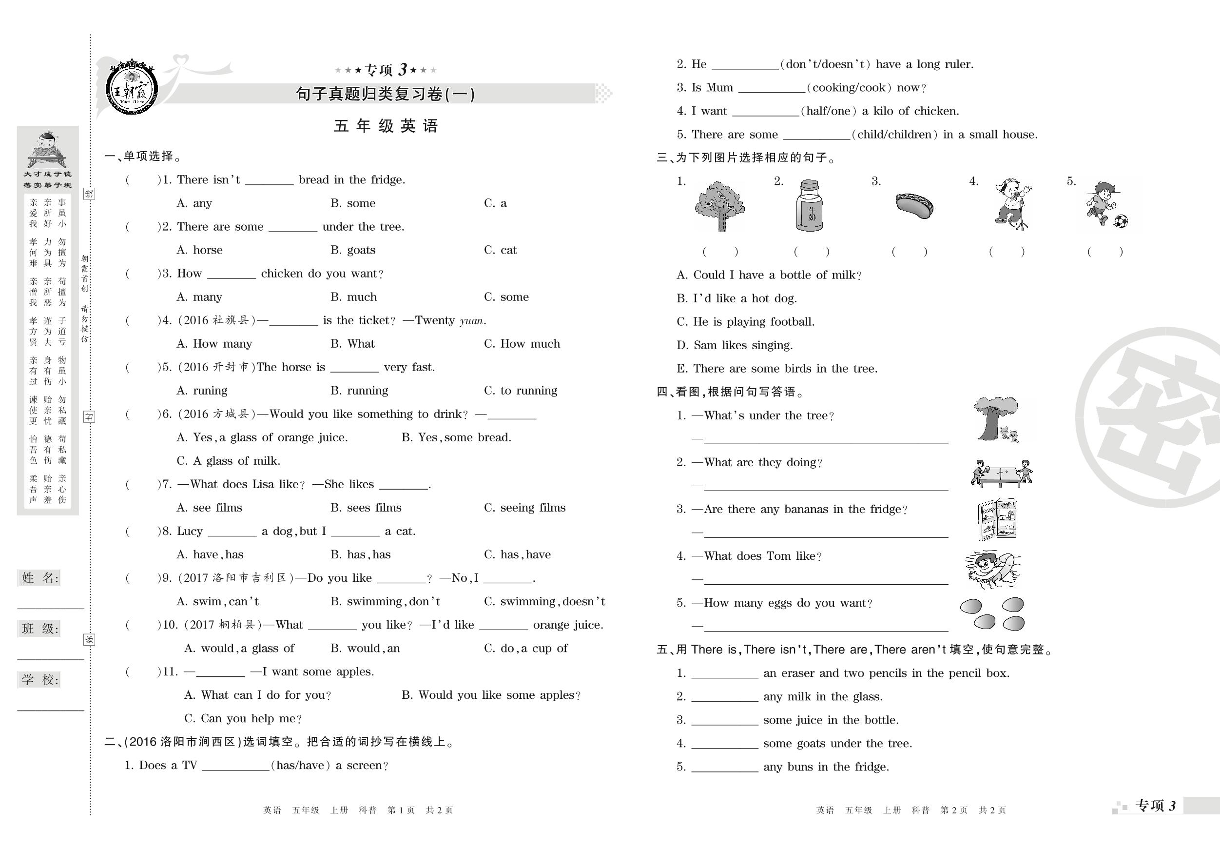 五年级英语科普版上册专项卷