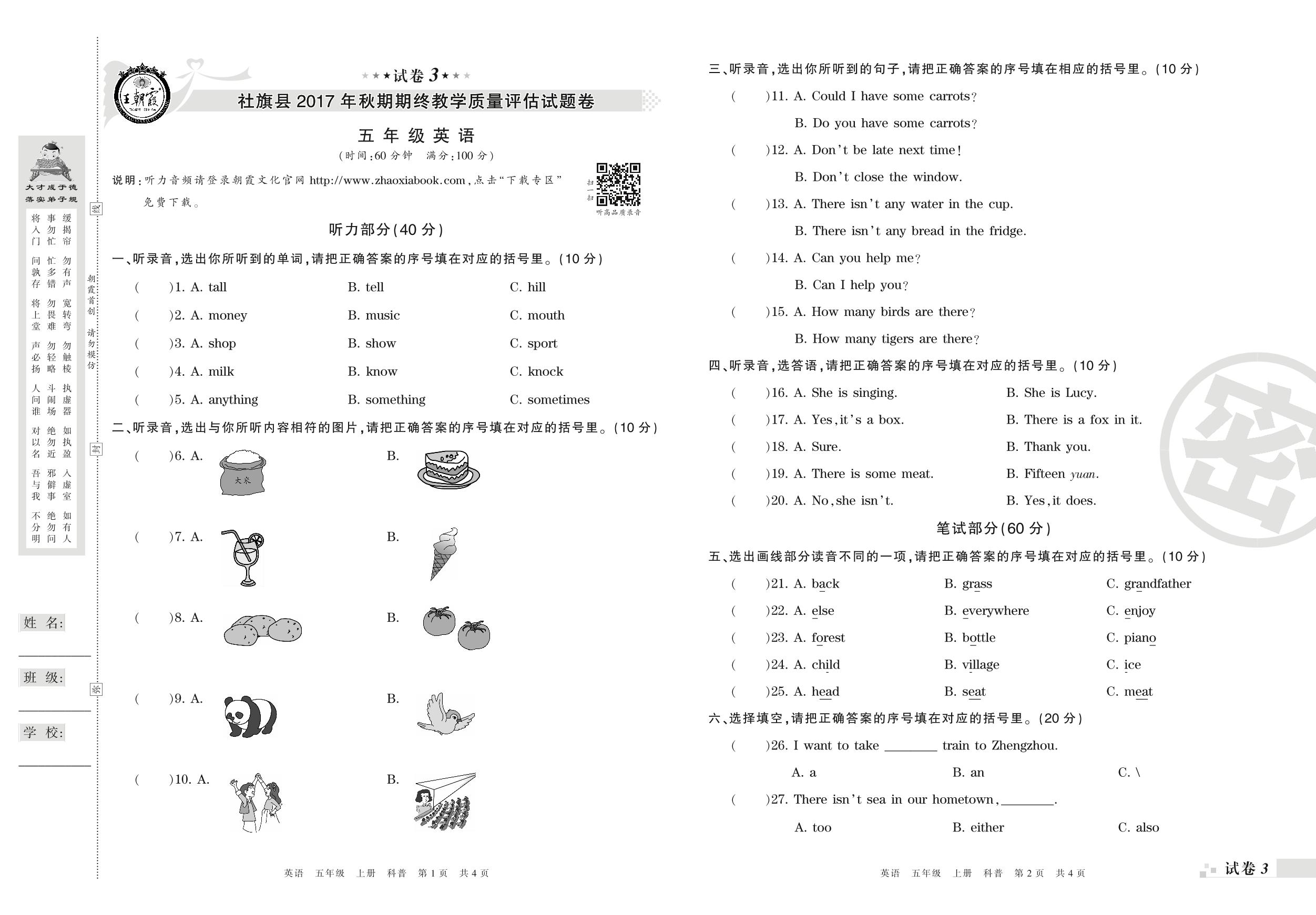 2017-2018学年第一学期南阳市社旗县五年级英语试卷(科普版)【3】