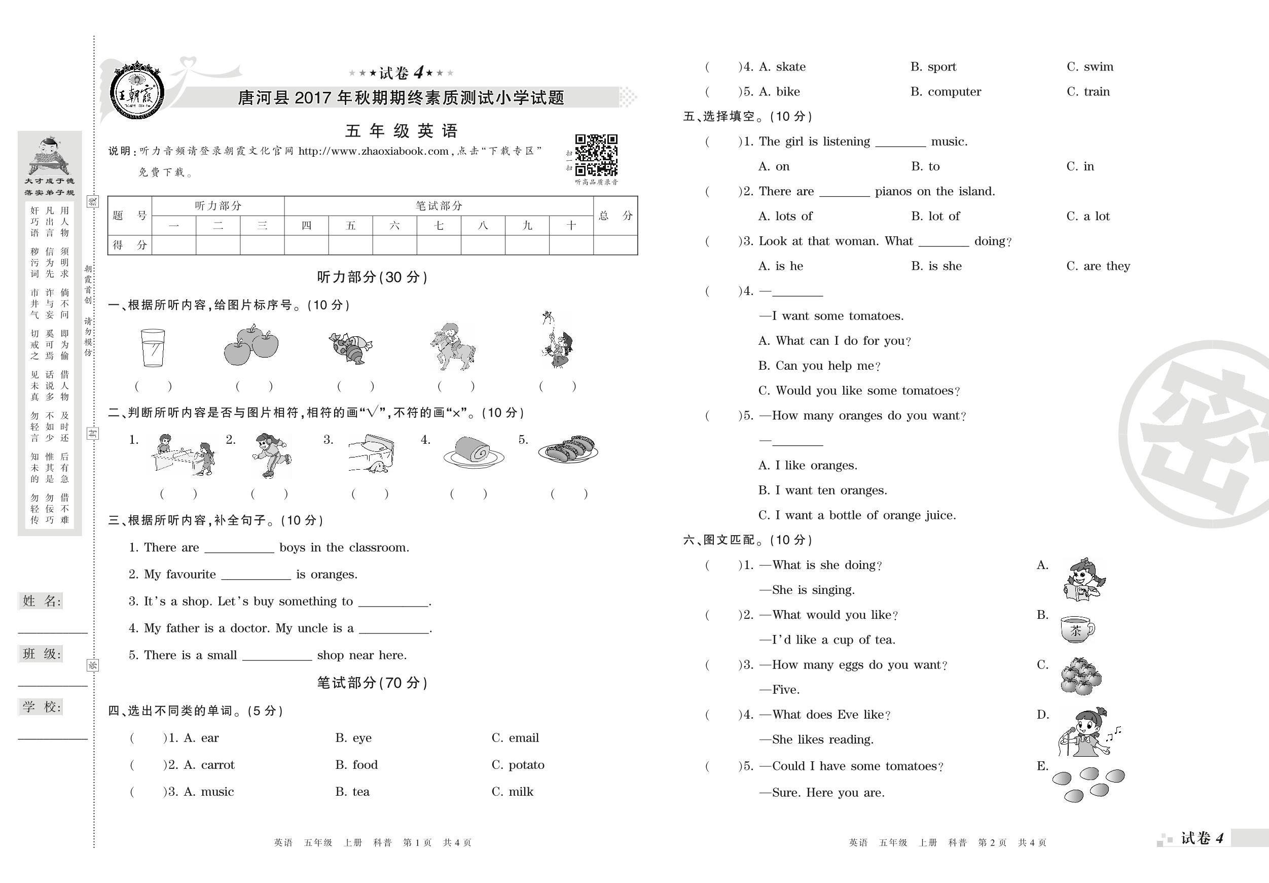 2017-2018学年第一学期南阳市唐河县五年级英语试卷(科普版)【4】