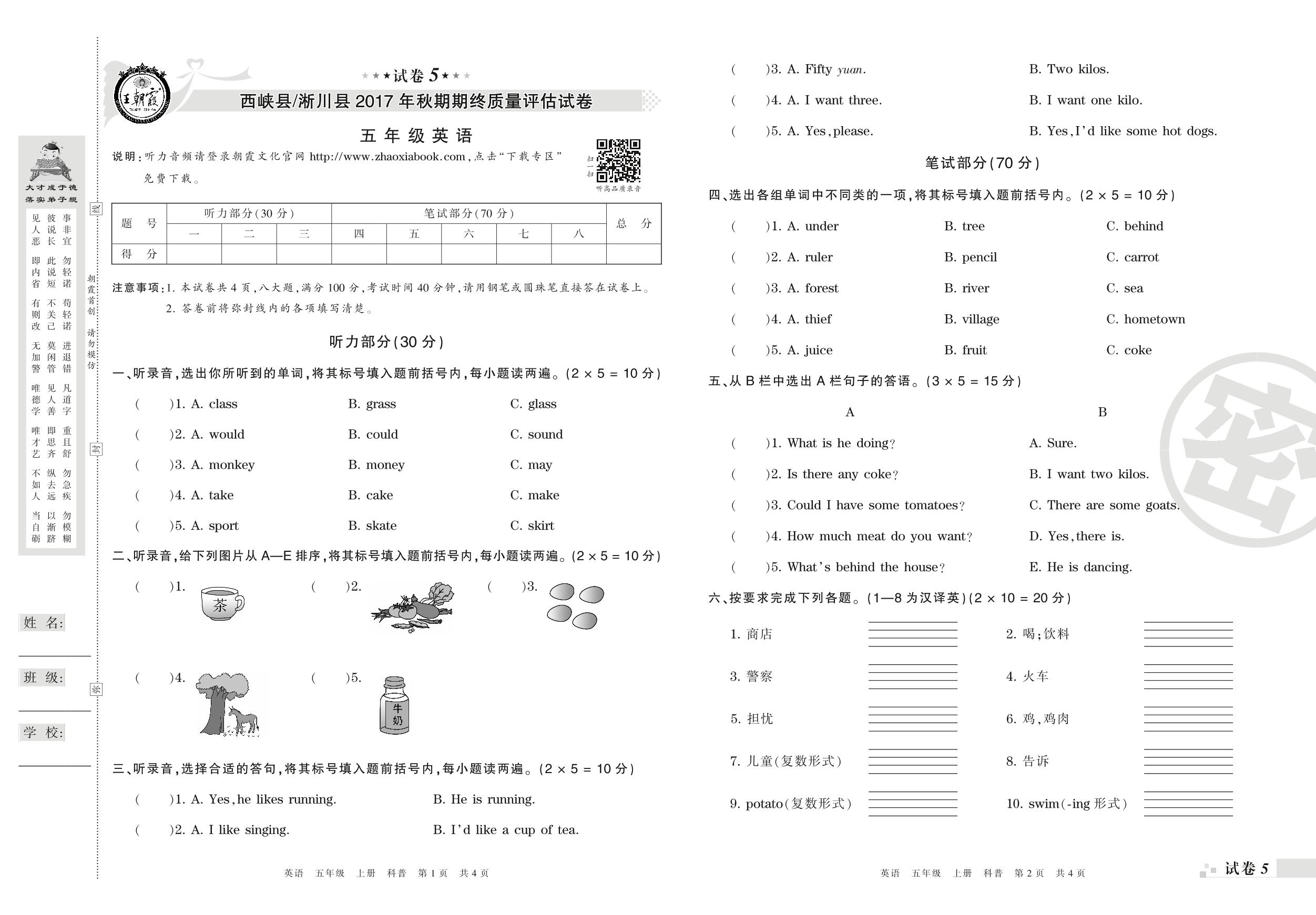 2017-2018学年第一学期南阳市西峡县 淅川县五年级英语试卷(科普版)【5】