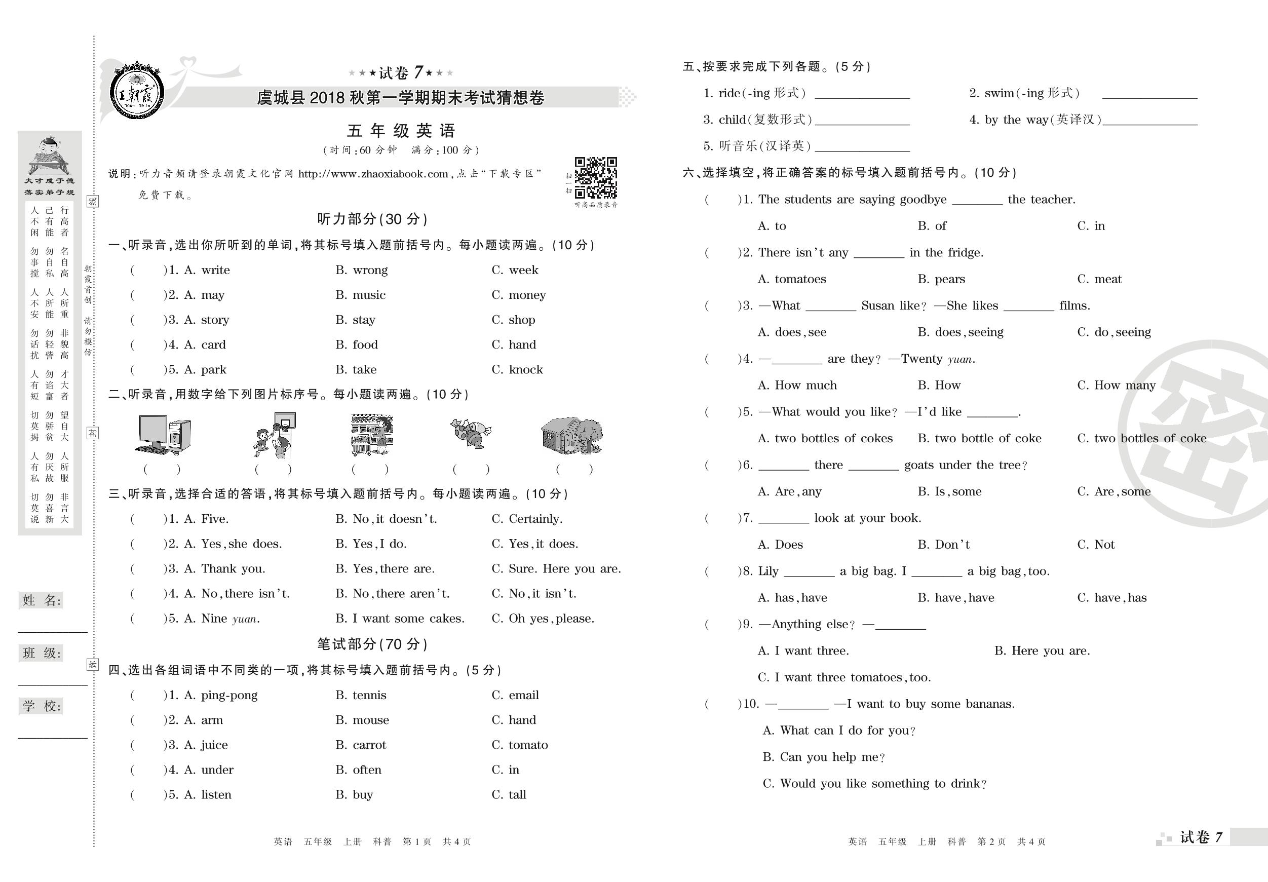 2017-2018学年第一学期商丘市虞城县五年级英语试卷(科普版)【7】