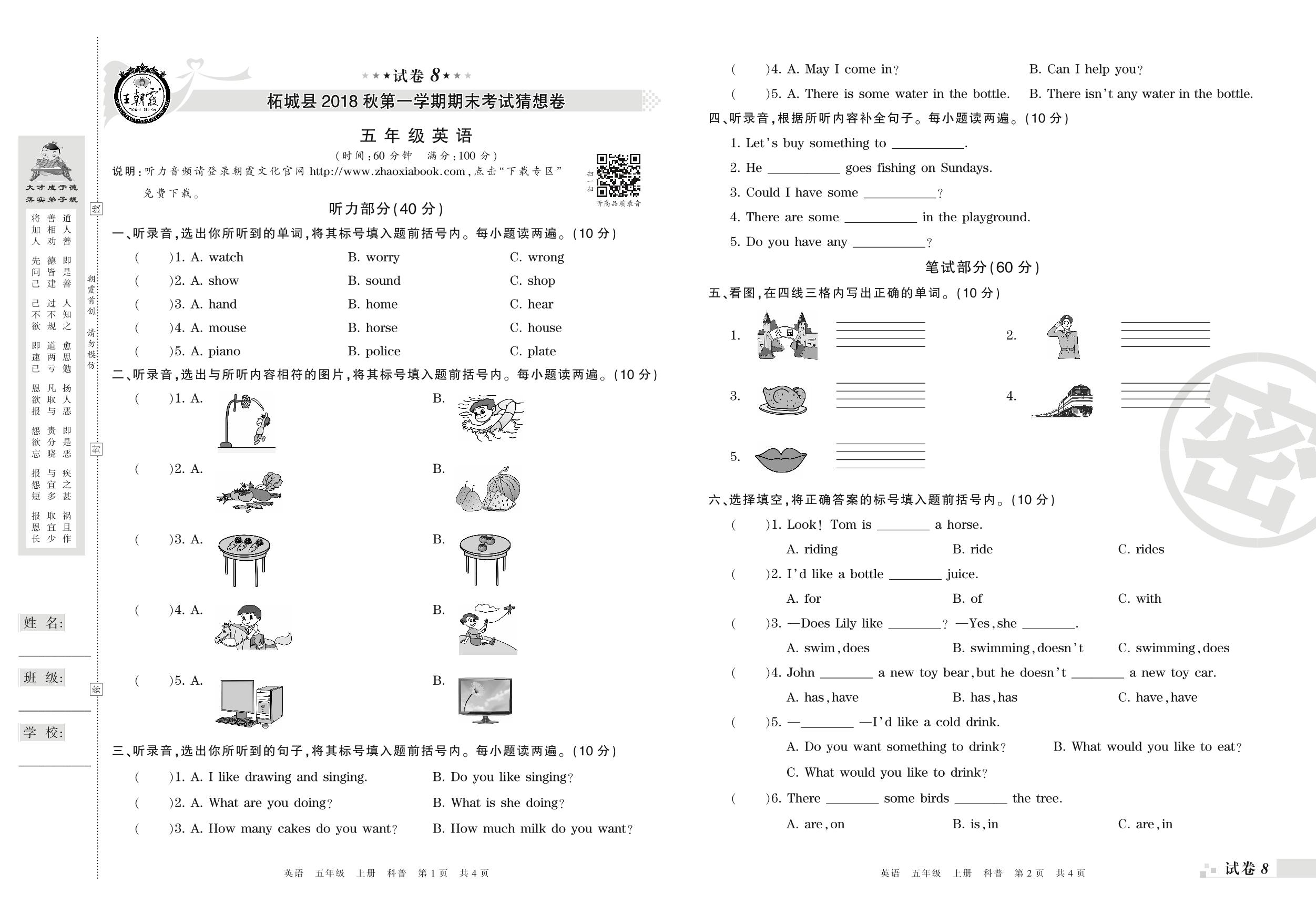 2017-2018学年第一学期商丘市柘城县五年级英语试卷(科普版)【8】