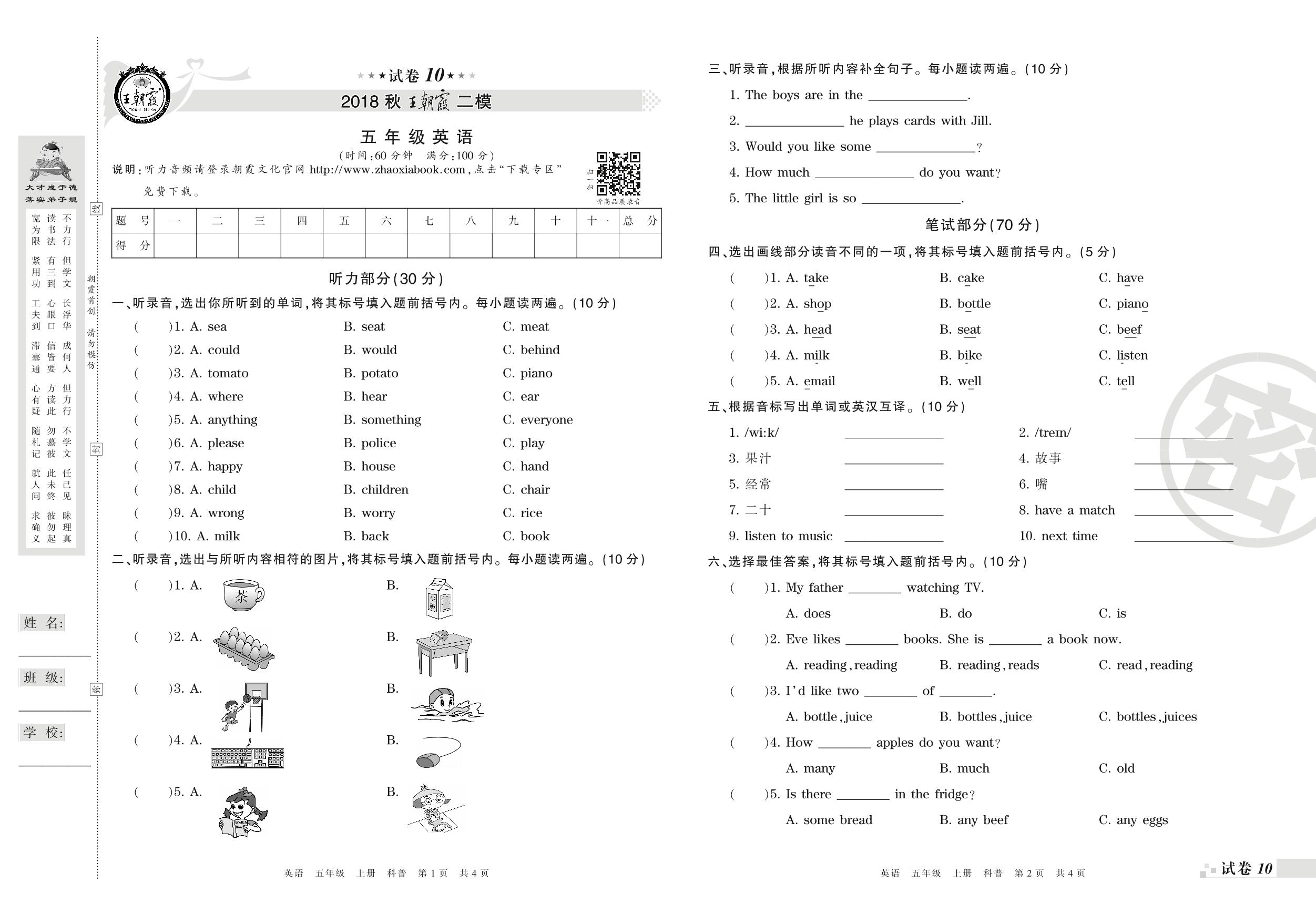 王朝霞期末模拟卷五年级上册英语(科普版)_R210807151841【10】