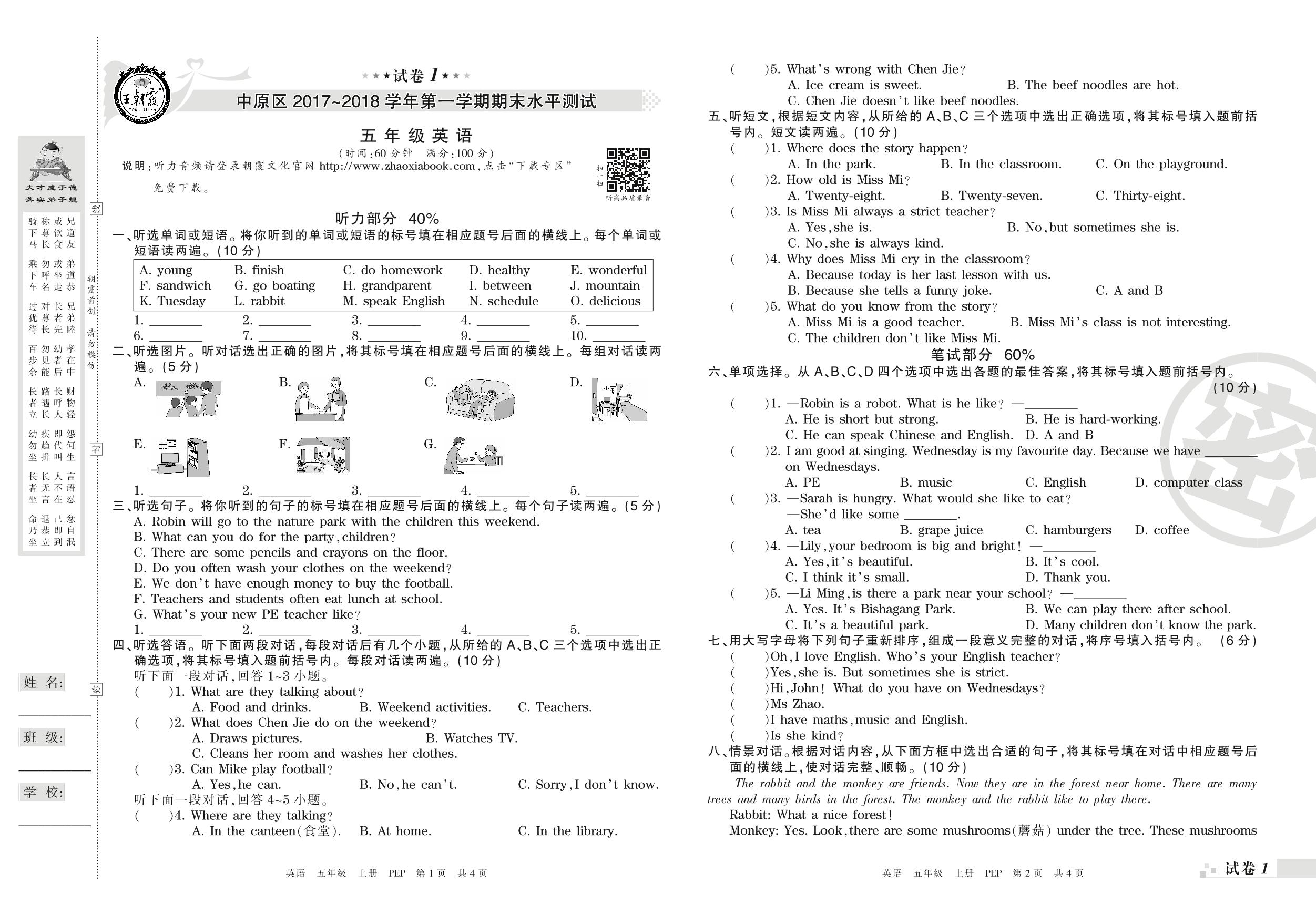 2017-2018学年第一学期郑州市中原区五年级英语试卷(PEP版)【1】