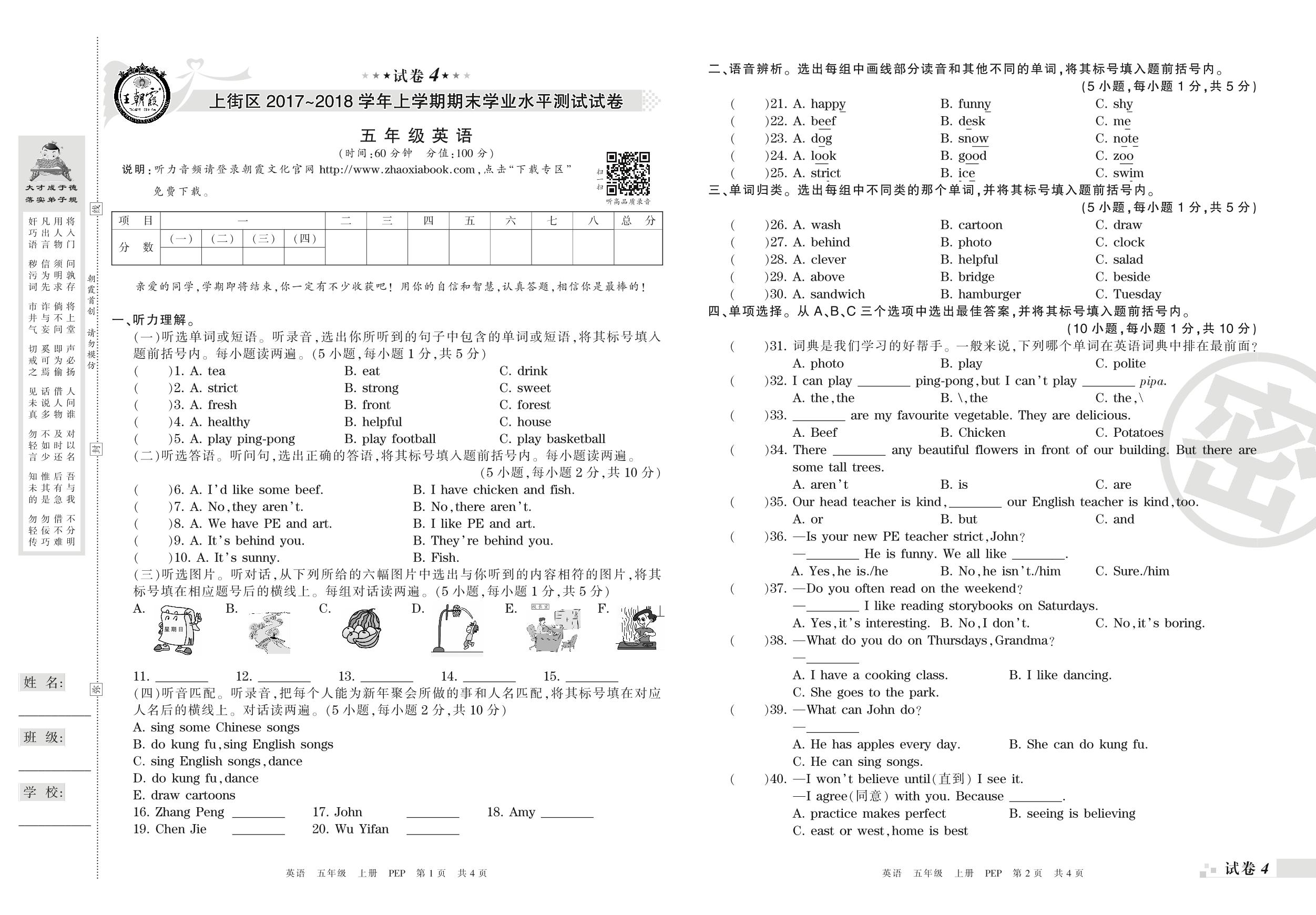 2017-2018学年第一学期郑州市上街区五年级英语试卷(PEP版)【4】