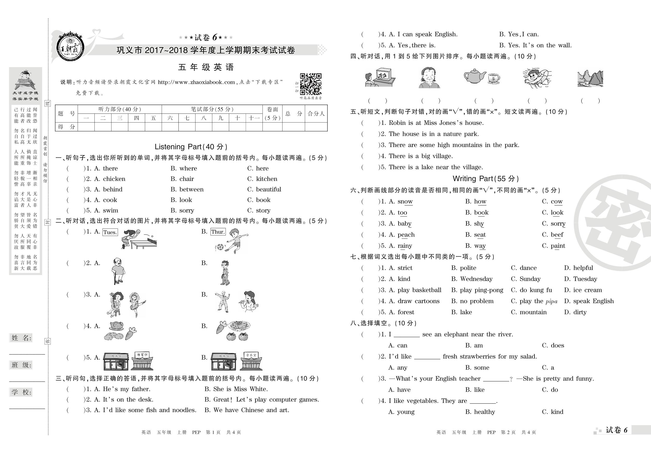 2017-2018学年第一学期巩义市五年级英语试卷(PEP版)【6】
