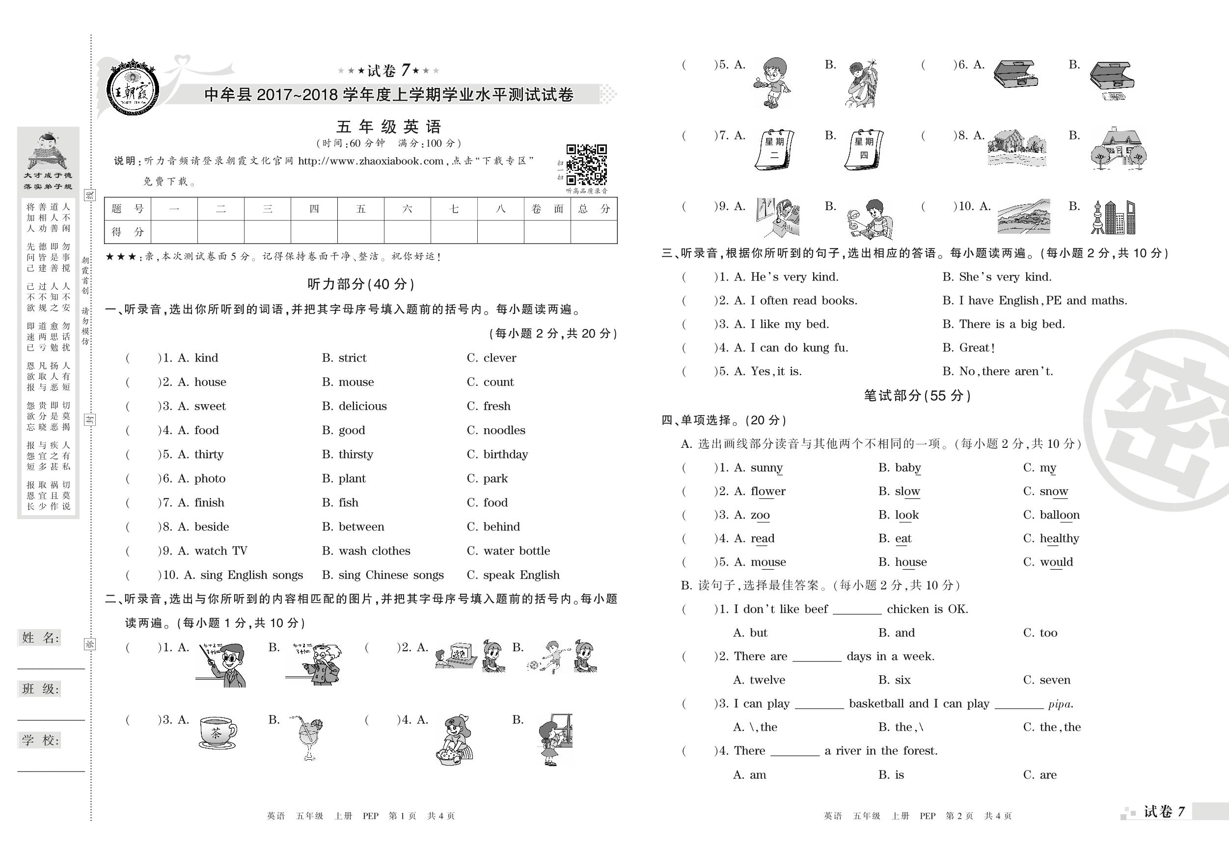 2017-2018学年第一学期郑州市中牟县五年级英语试卷(PEP版)【7】