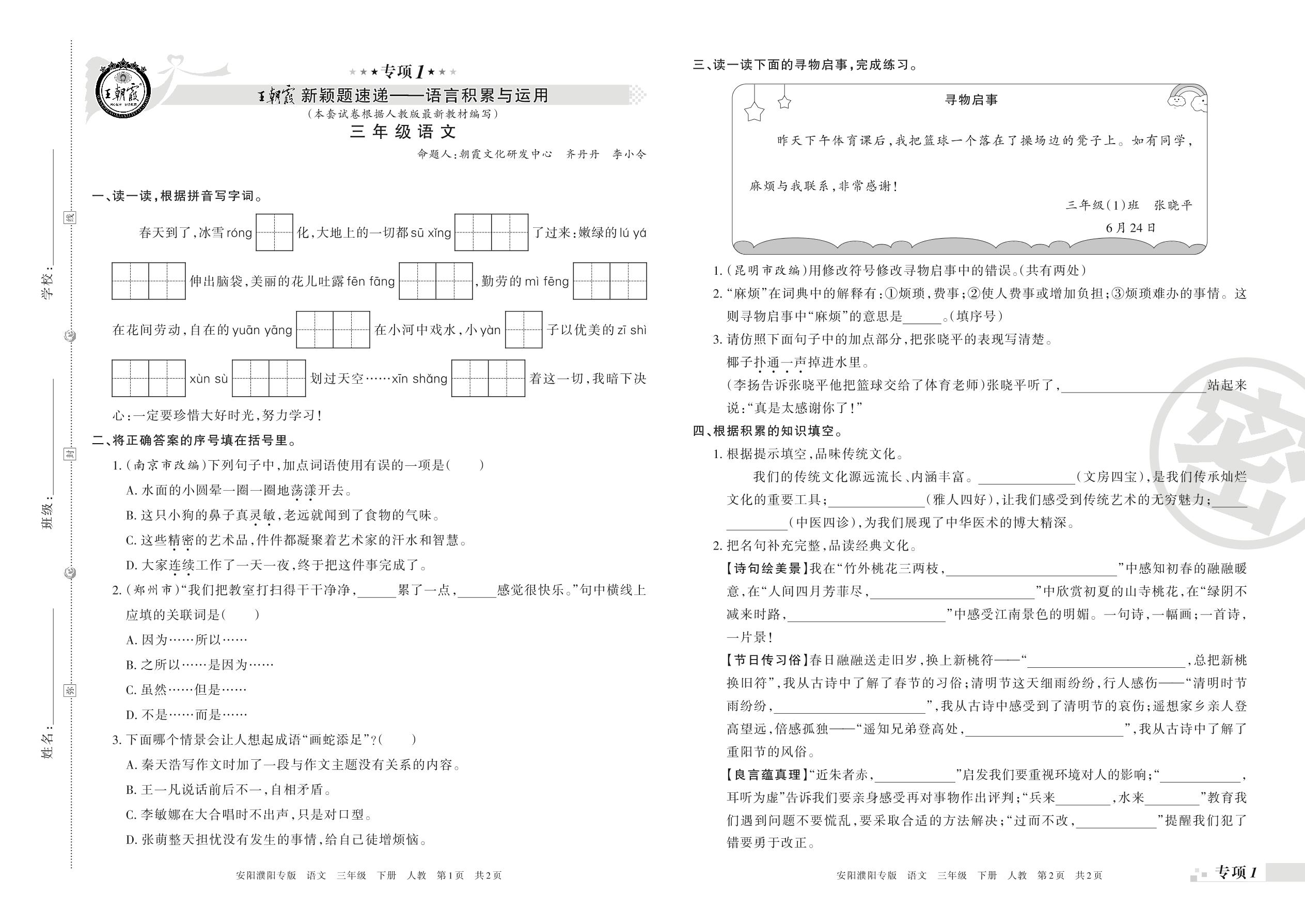 王朝霞期末专项卷——语言积累与运用、口语交际与综合性学习三年级下册语文(人教版)_R21080183312【0】