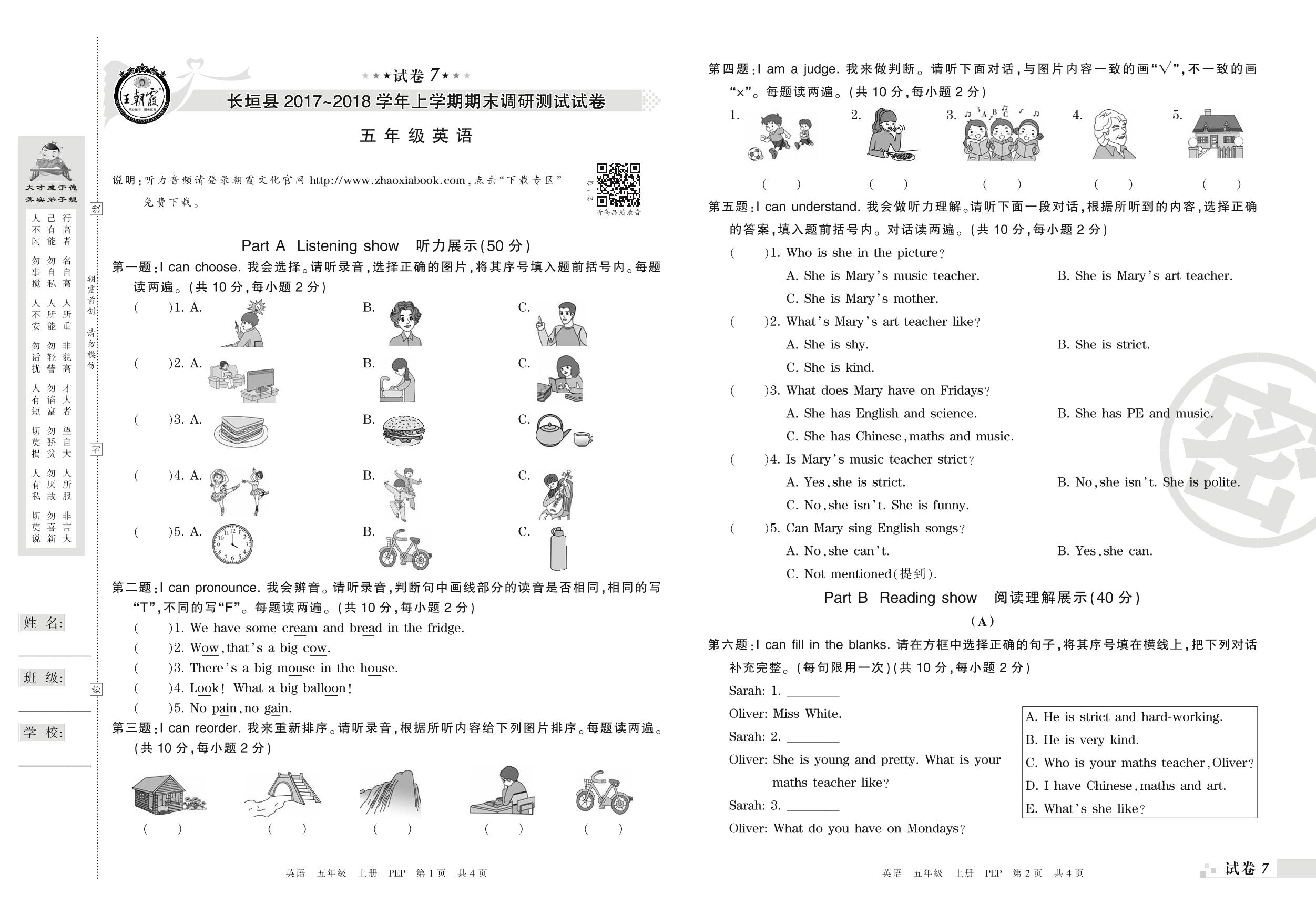 2017-2018学年第一学期新乡市长垣县五年级英语试卷(PEP版)【7】
