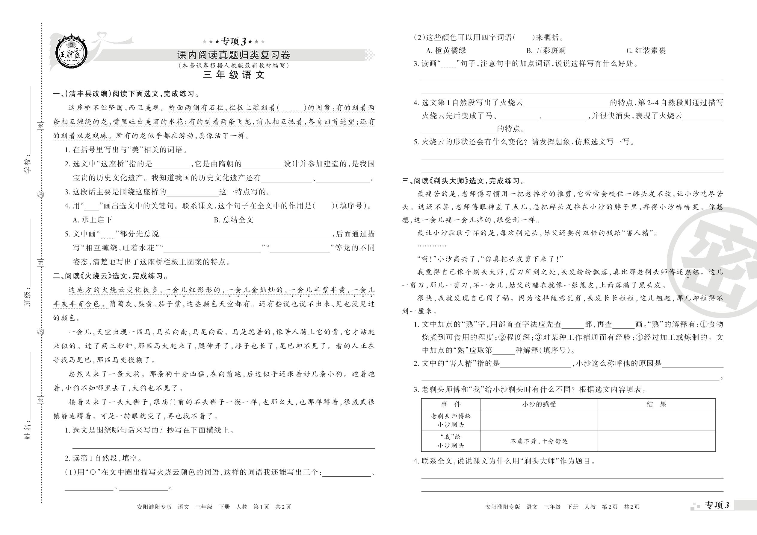 王朝霞期末专项卷——课内阅读、课外阅读真题归类复习三年级下册语文(人教版)_R21080183317【0】