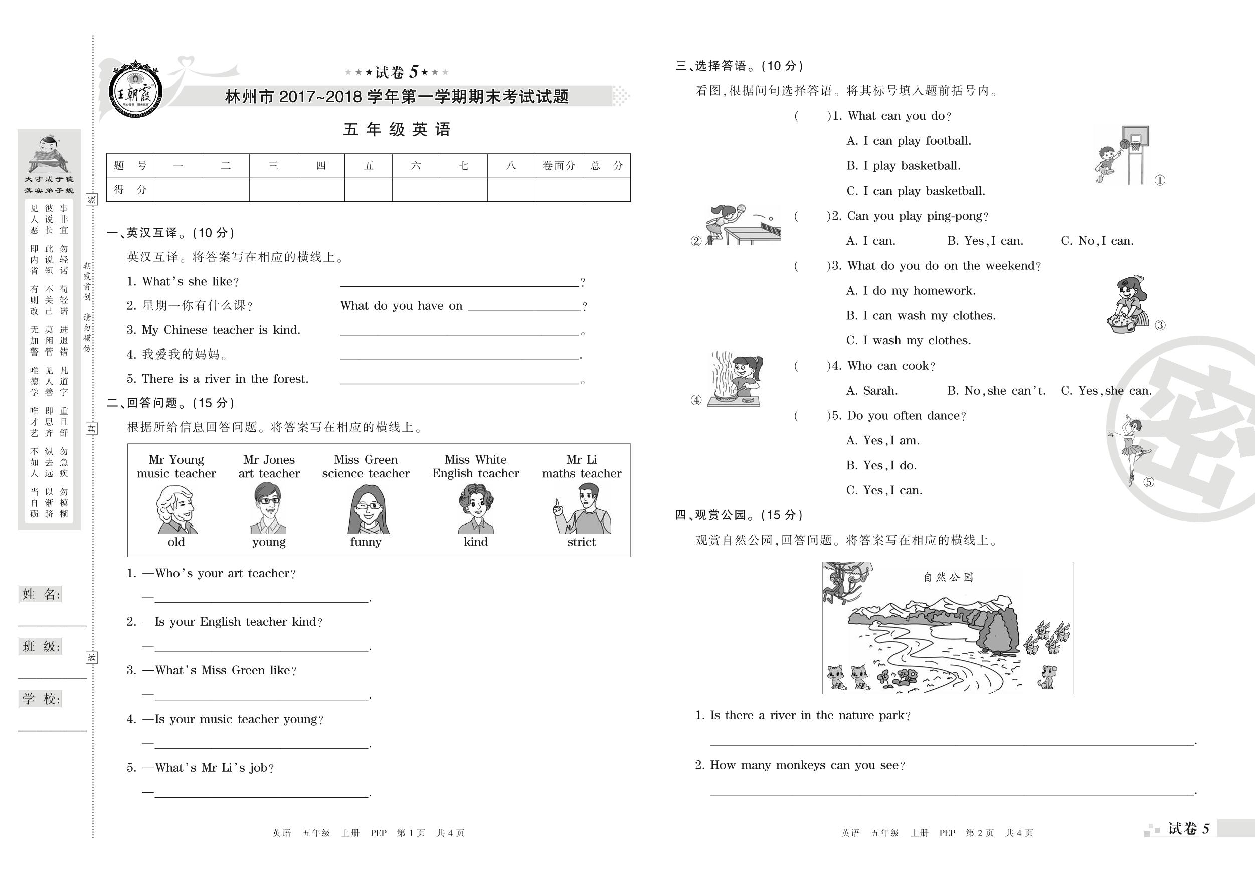 2017-2018学年第一学期林州市五年级英语试卷(PEP版)_R210807152011【5】