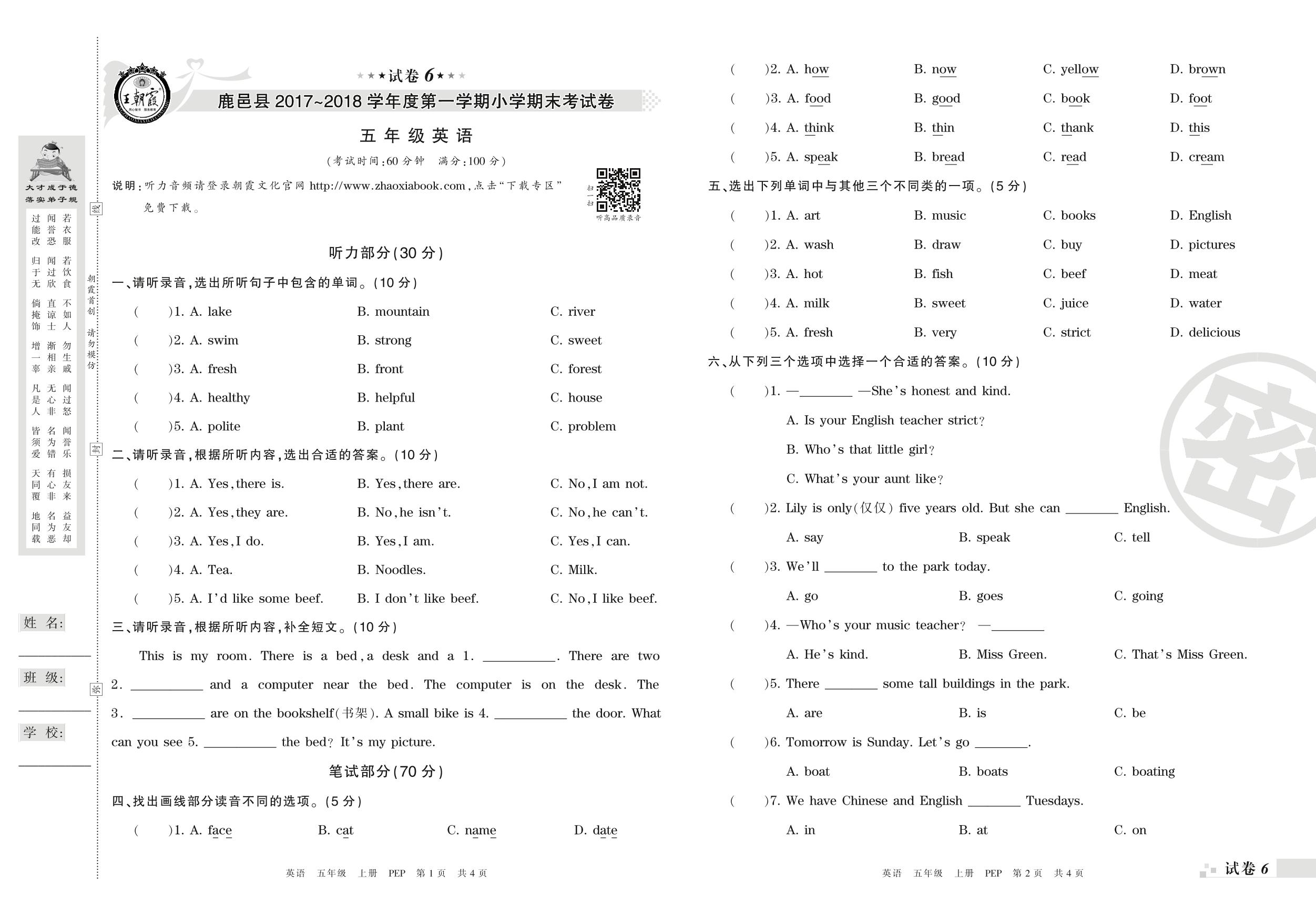 2017-2018学年第一学期周口市鹿邑县五年级英语试卷(PEP版)【6】