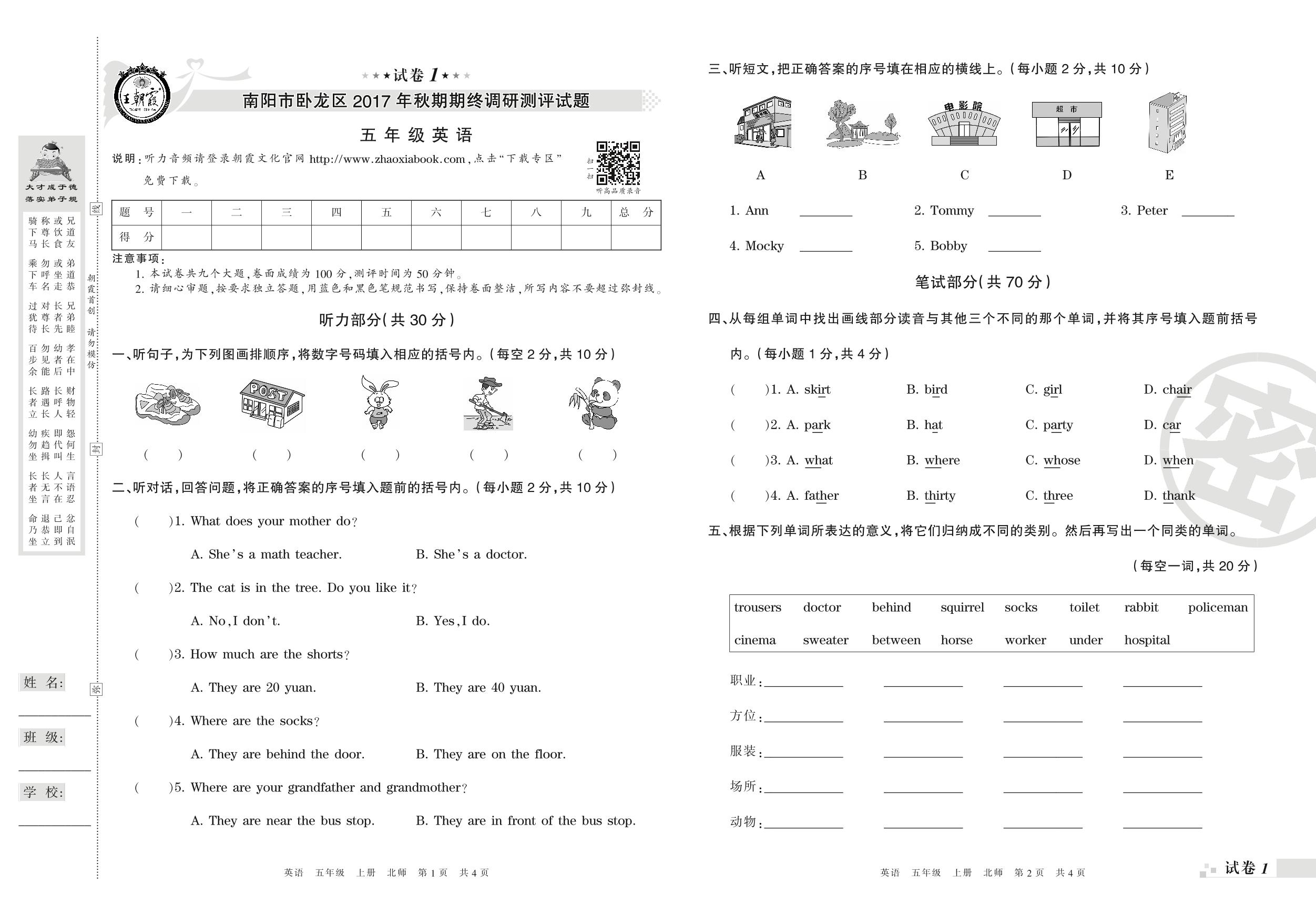 2017-2018学年第一学期南阳市卧龙区五年级英语试卷(北师版)【1】