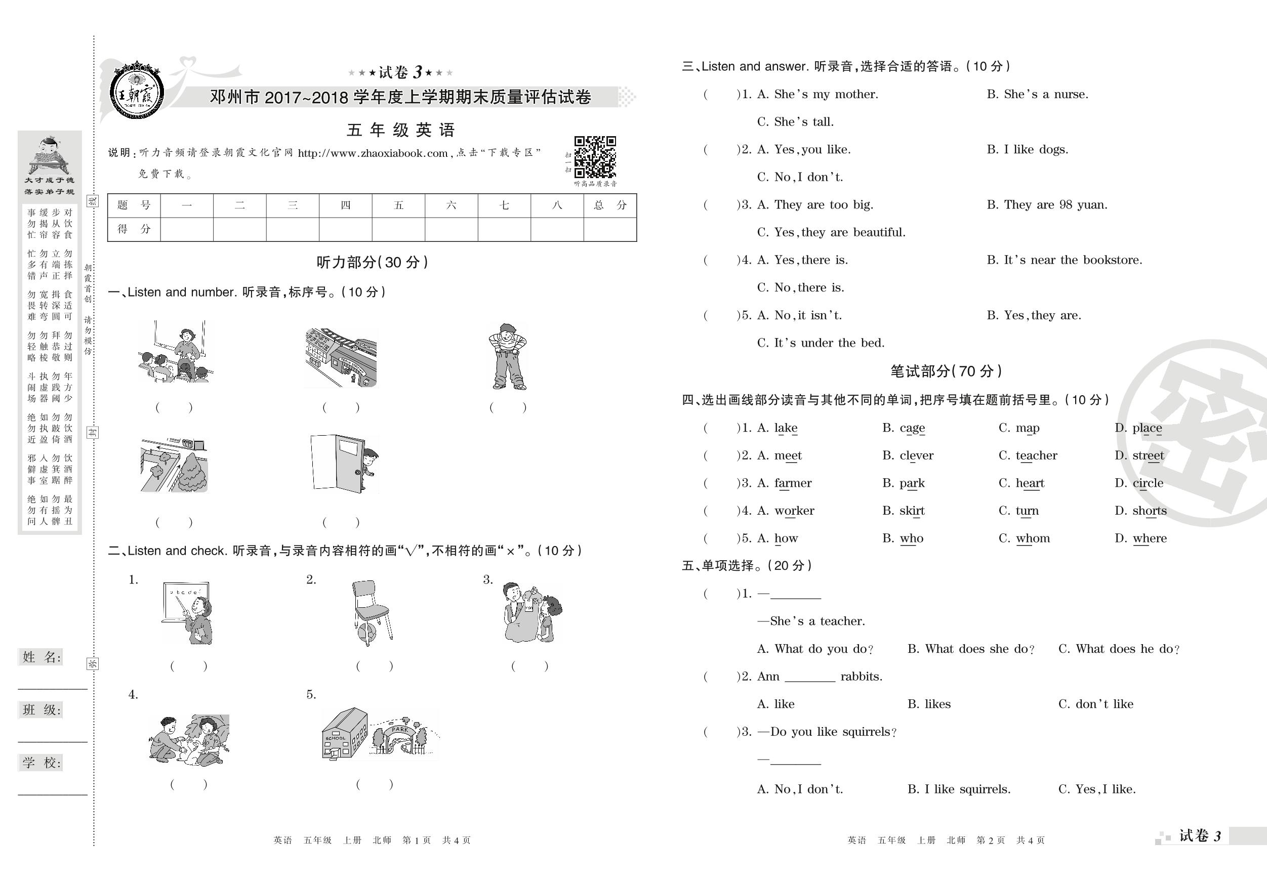 2017-2018学年第一学期邓州市五年级英语试卷(北师版)【3】