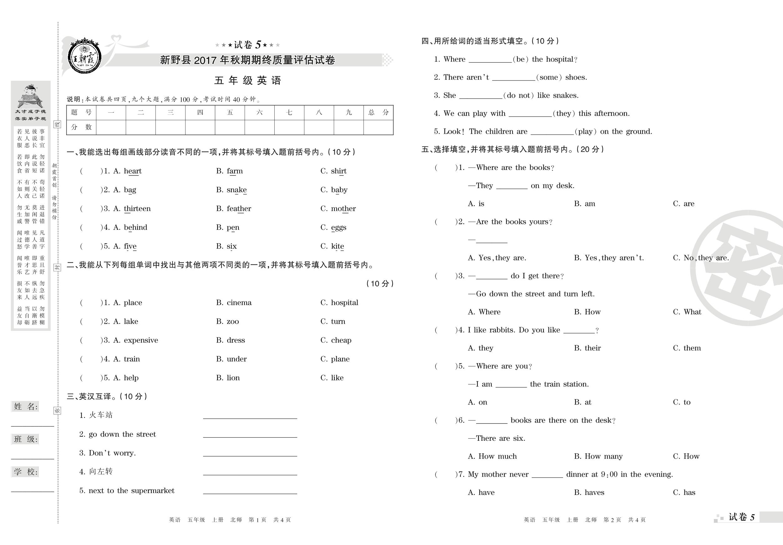 2017-2018学年第一学期南阳市新野县五年级英语试卷(北师版)【5】