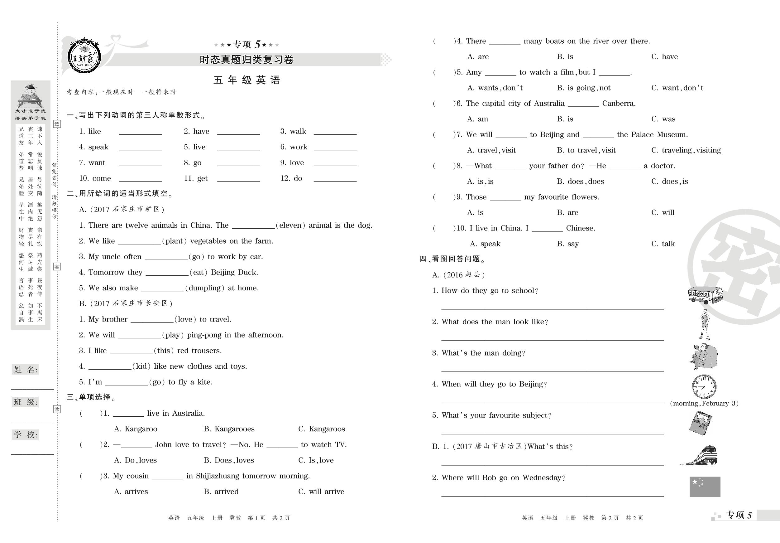 王朝霞期末专项卷——时态、情景交际真题归类复习五年级上册英语(冀教版)_R210807152106【0】