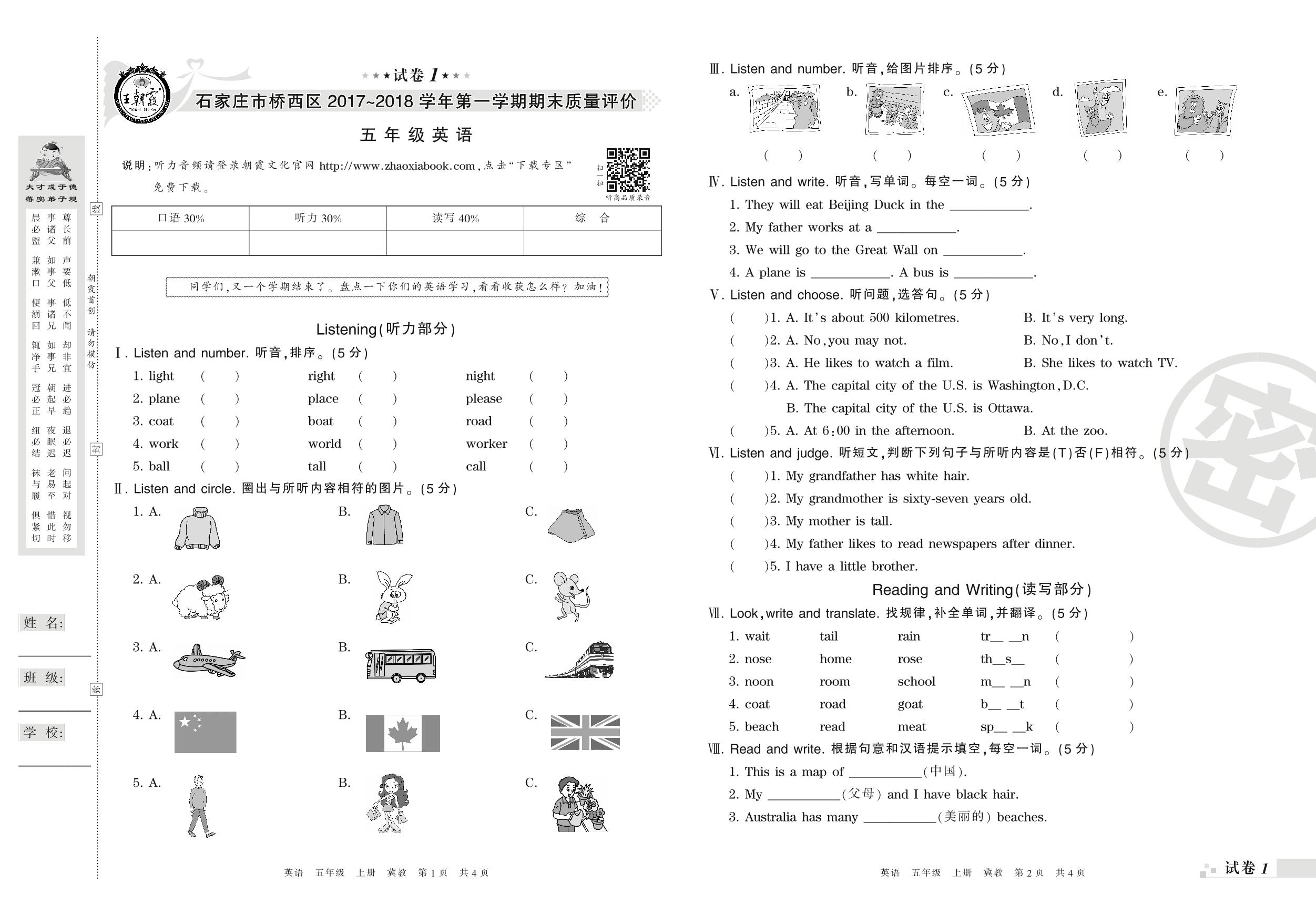 2017-2018学年第一学期石家庄市桥西区五年级英语试卷(冀教版)【1】