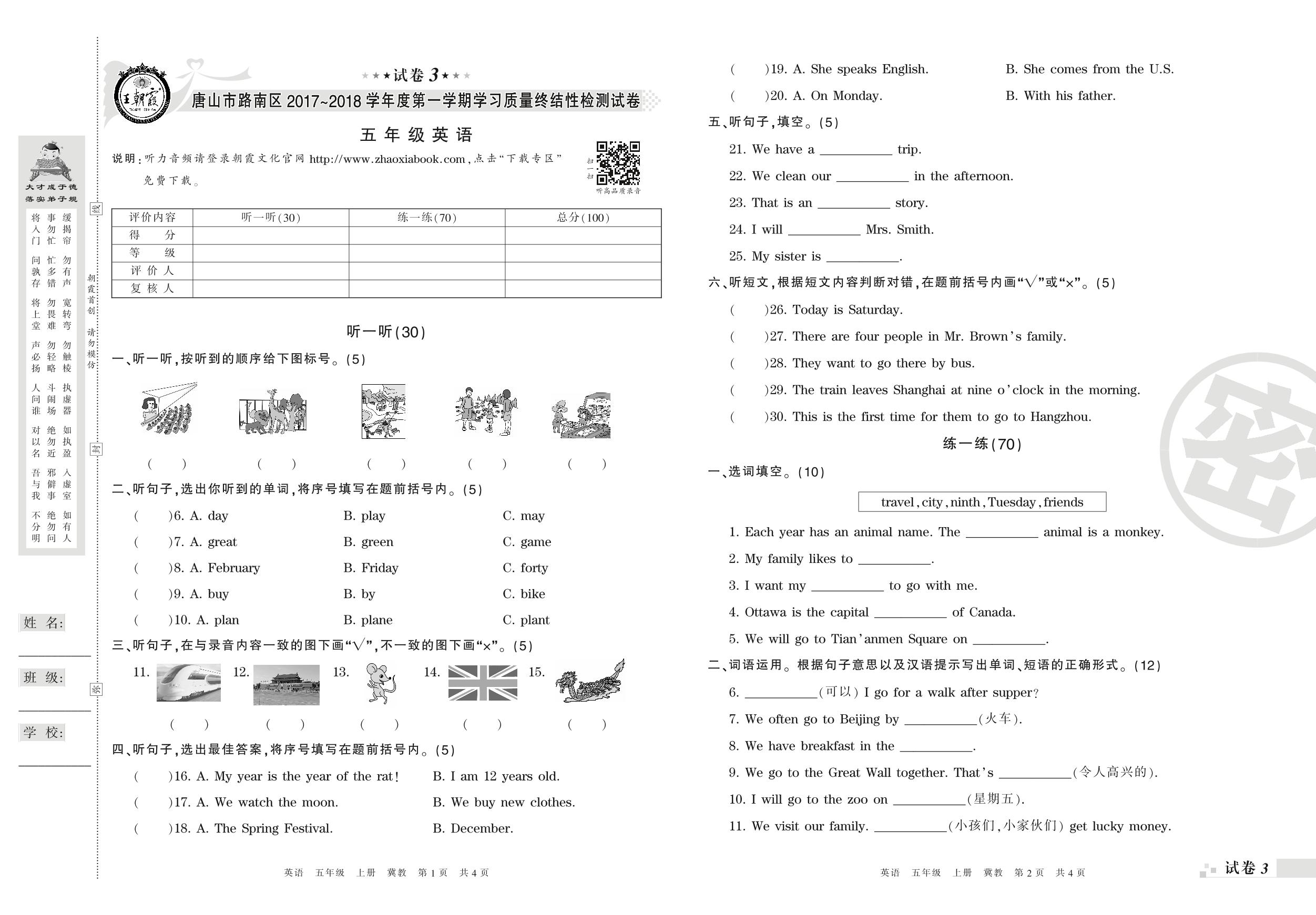 2017-2018学年第一学期唐山市路南区五年级英语试卷(冀教版)【3】