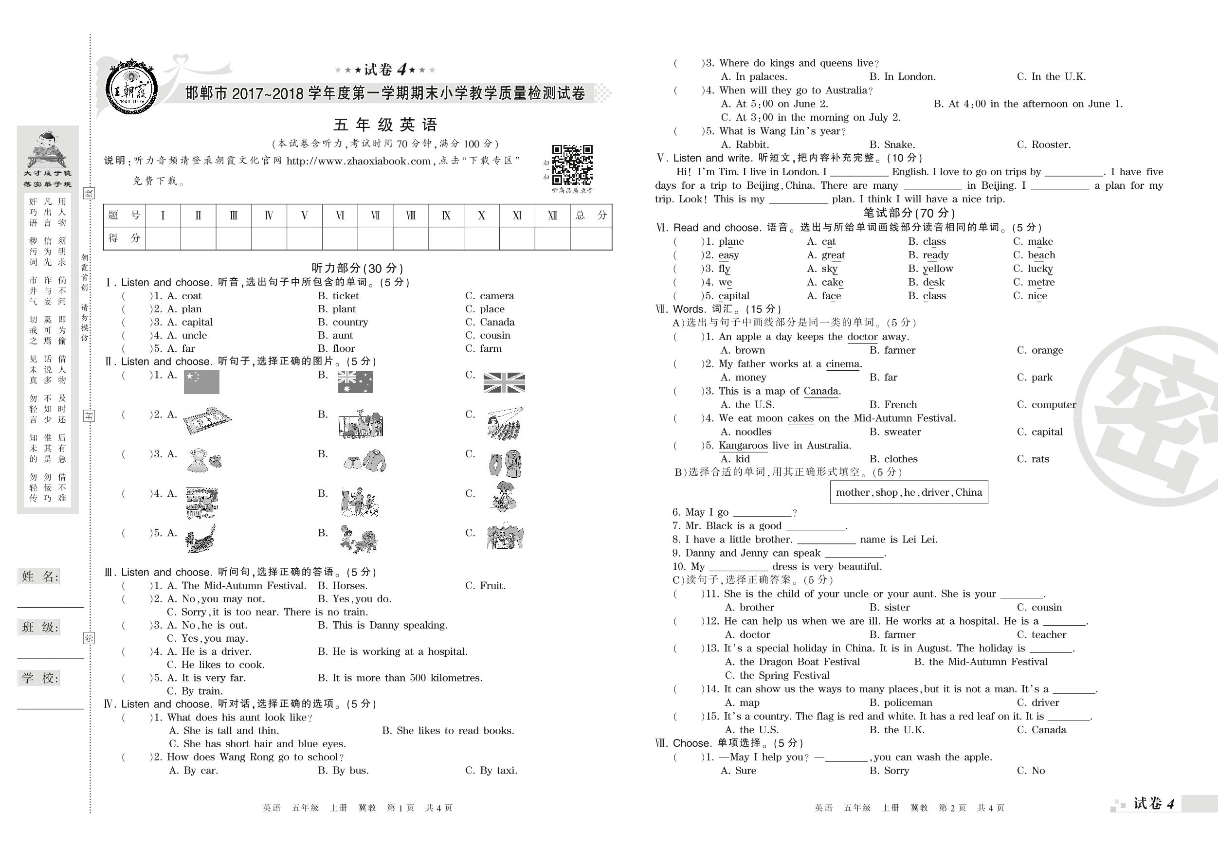 2017-2018学年第一学期邯郸市五年级英语试卷(冀教版)【4】