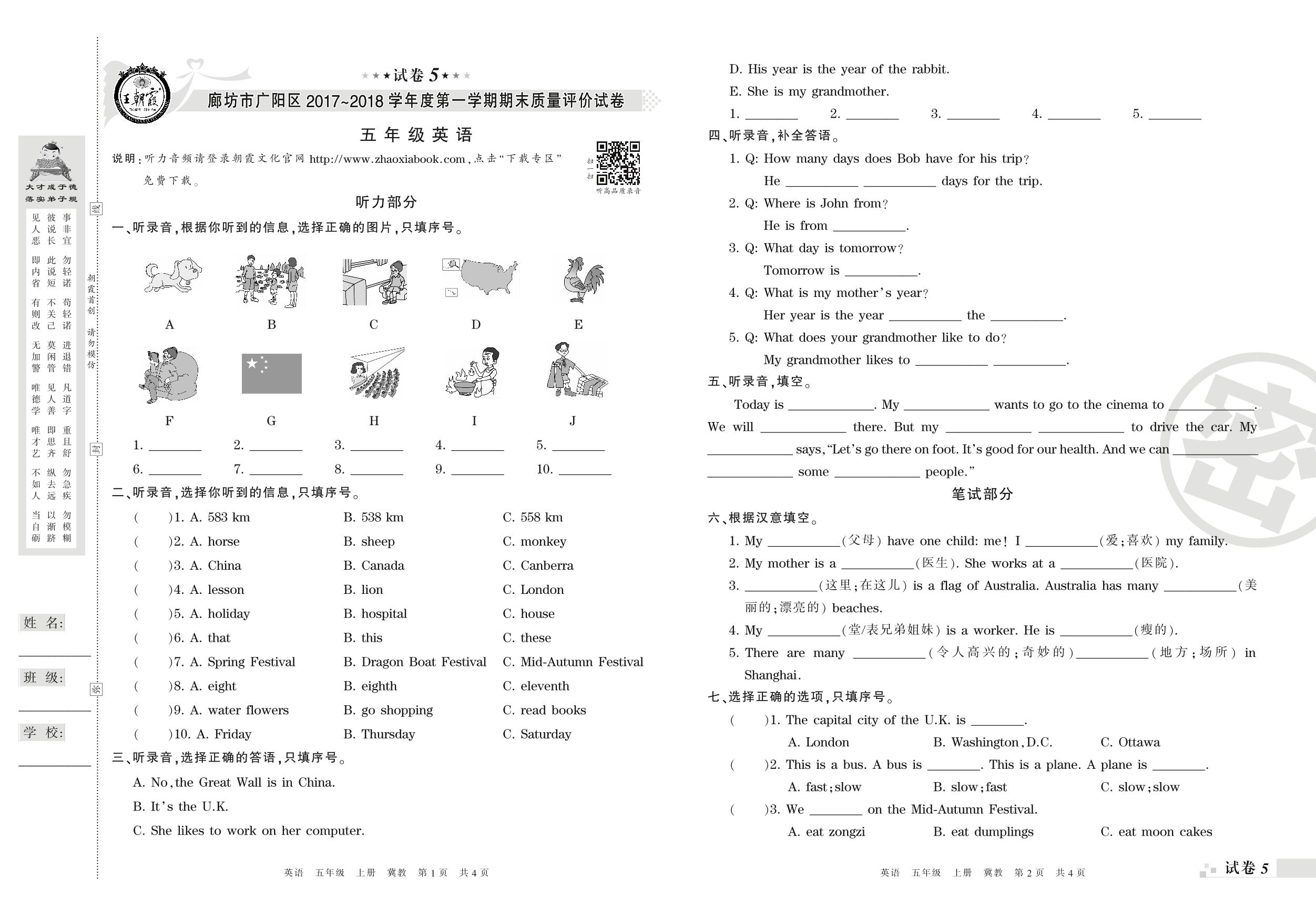 2017-2018学年第一学期廊坊市广阳区五年级英语试卷(冀教版)【5】