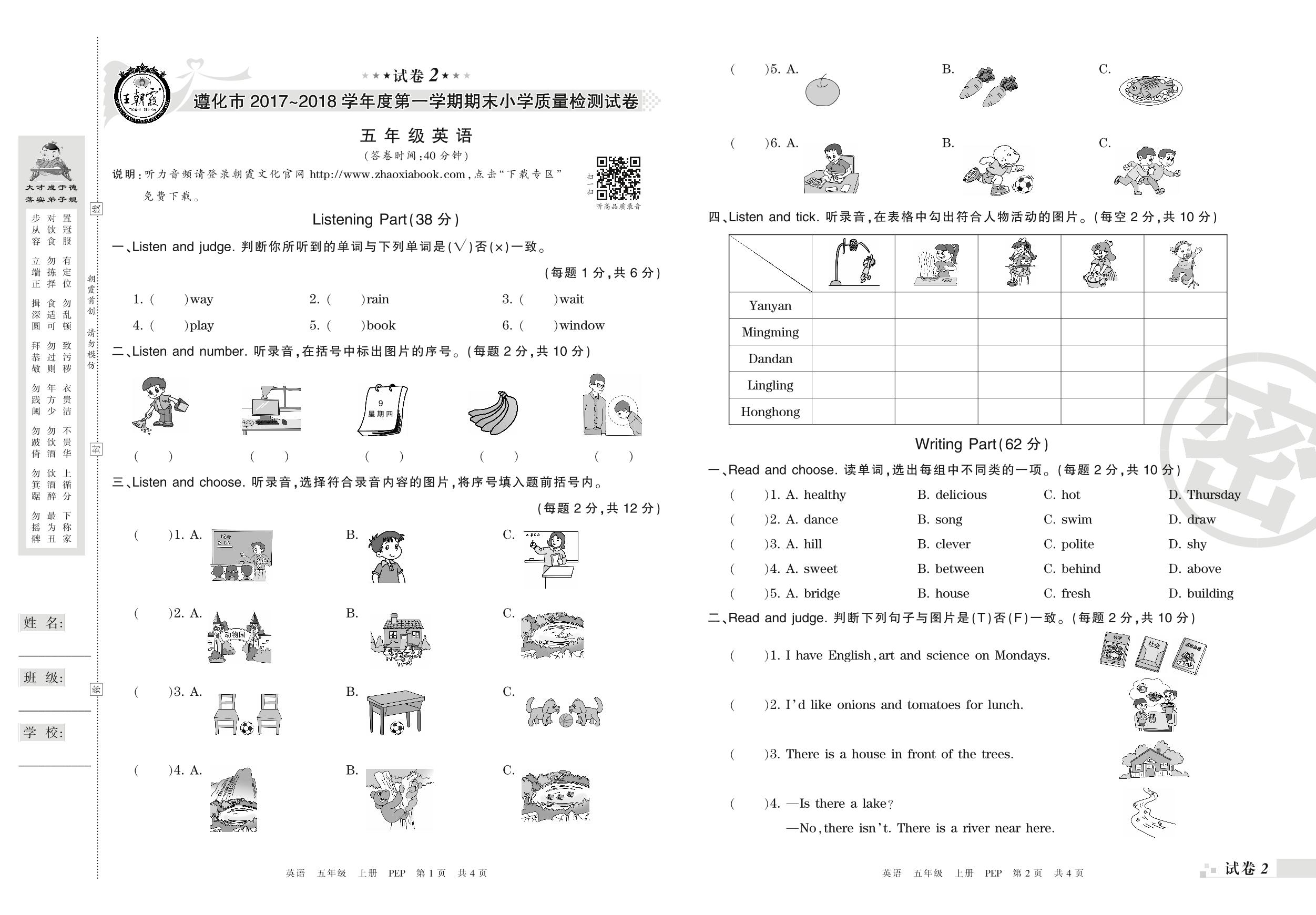 2017-2018学年第一学期遵化市五年级英语试卷(PEP版)【2】
