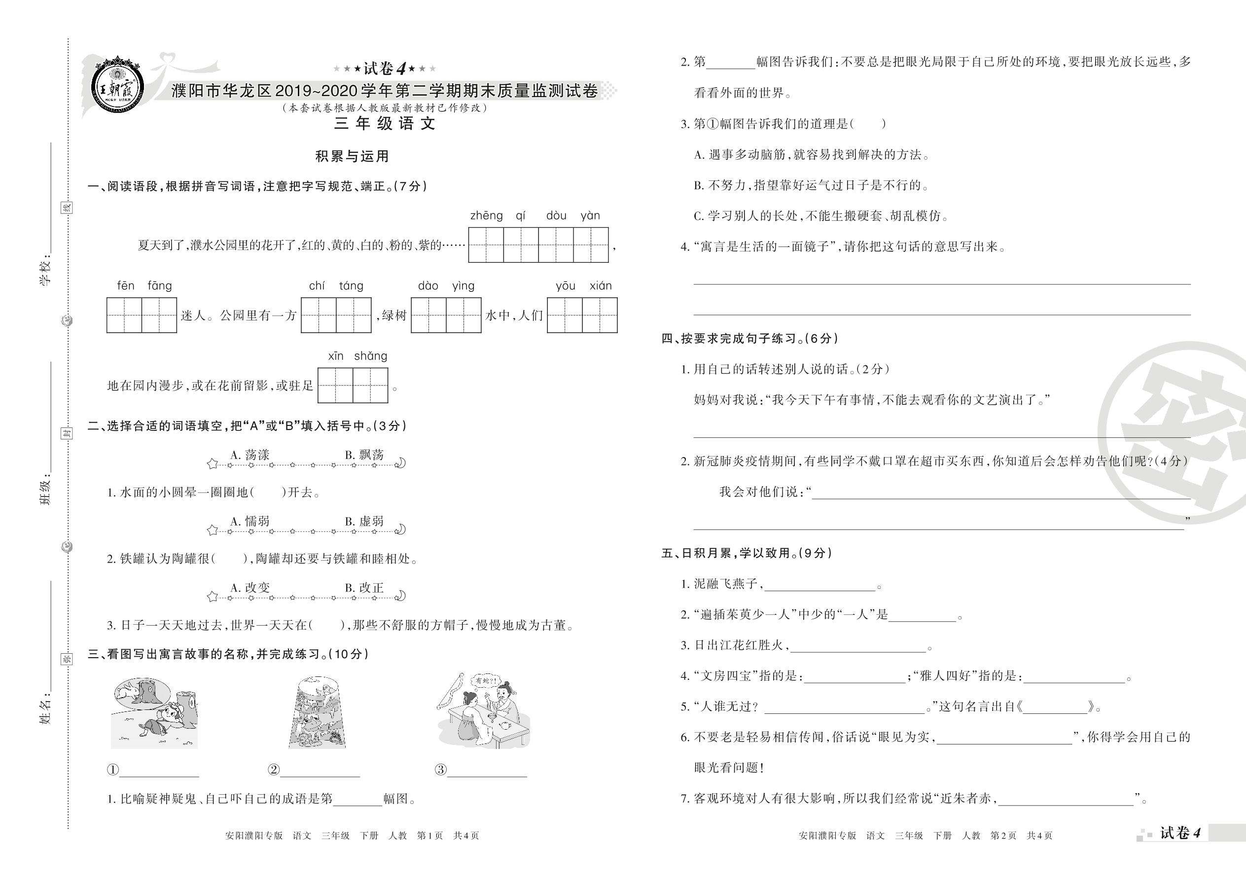 2019-2020学年第二学期濮阳市华龙区三年级语文试卷(人教版)【4】