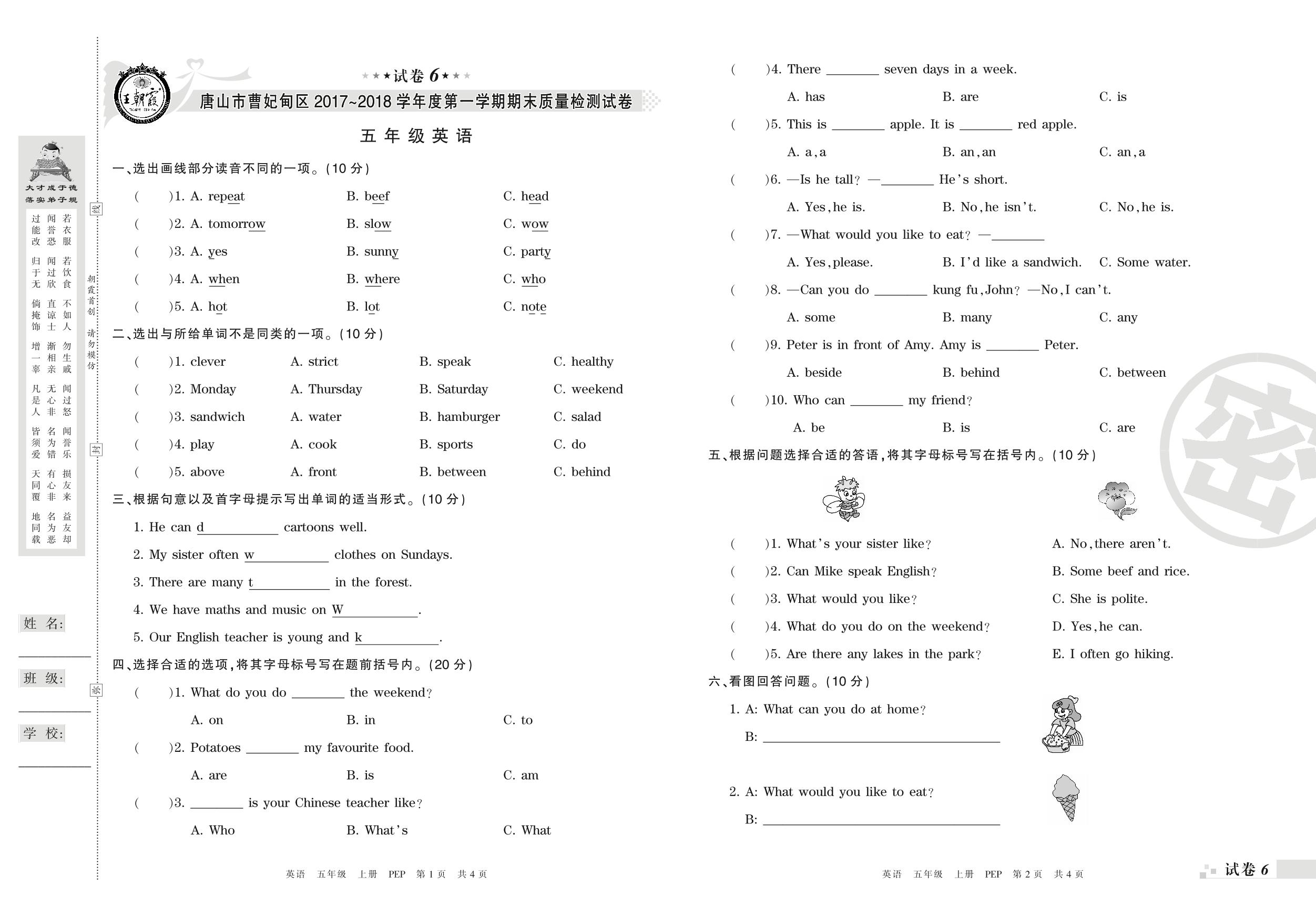 2017-2018学年第一学期唐山市曹妃甸区五年级英语试卷(PEP版)【6】