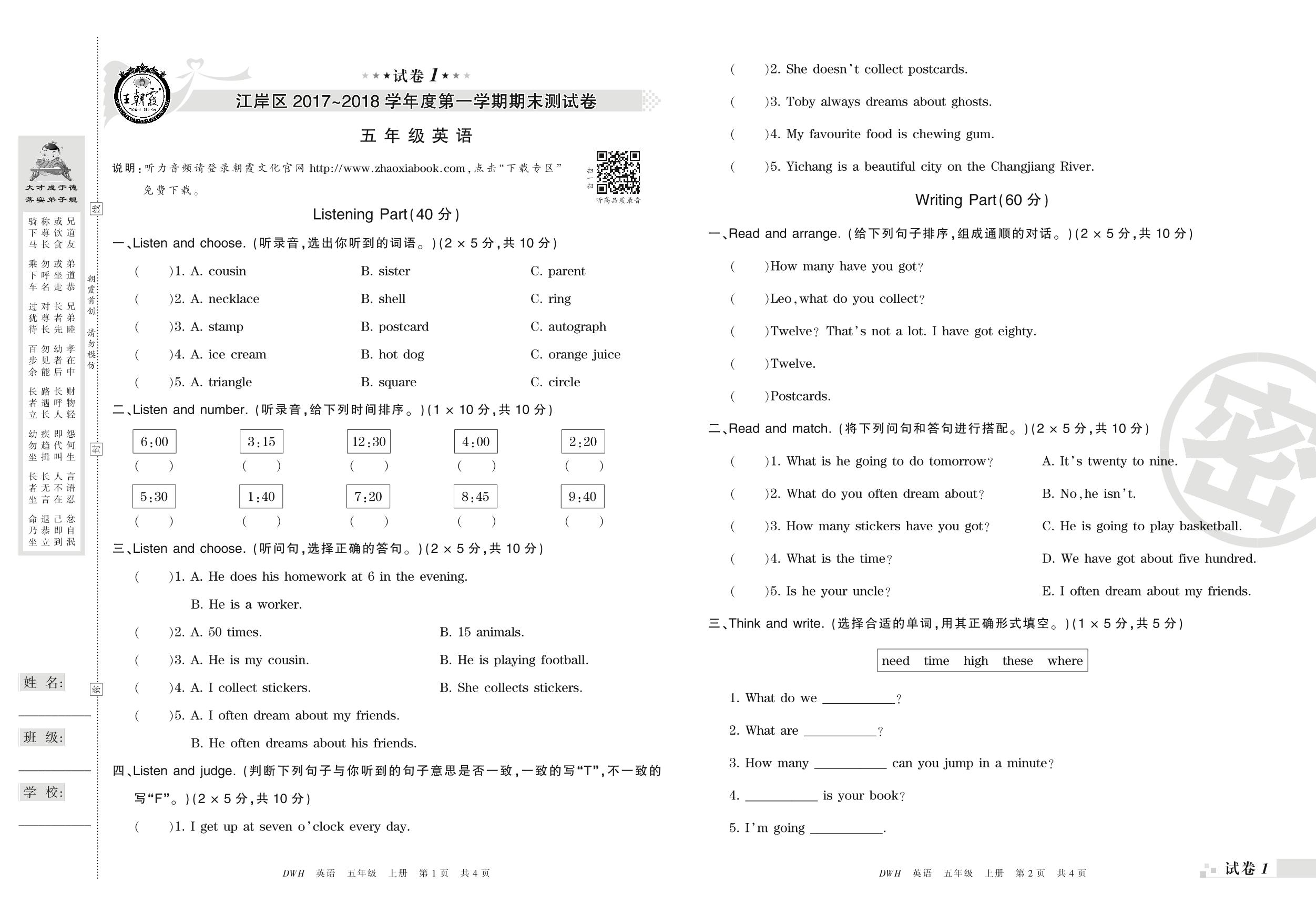 2017-2018学年第一学期武汉市江岸区五年级英语试卷(剑桥版)【1】