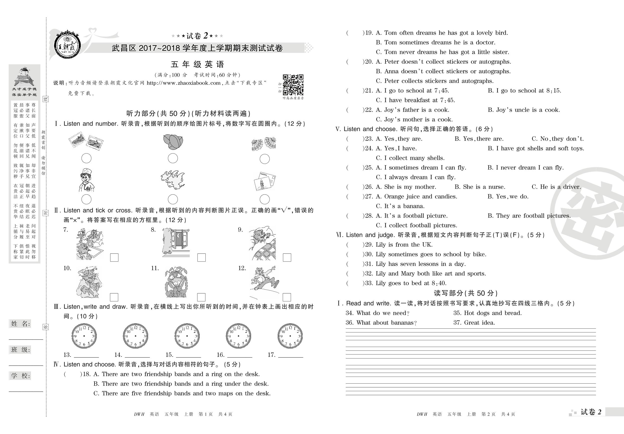 2017-2018学年第一学期武汉市武昌区五年级英语试卷(剑桥版)【2】