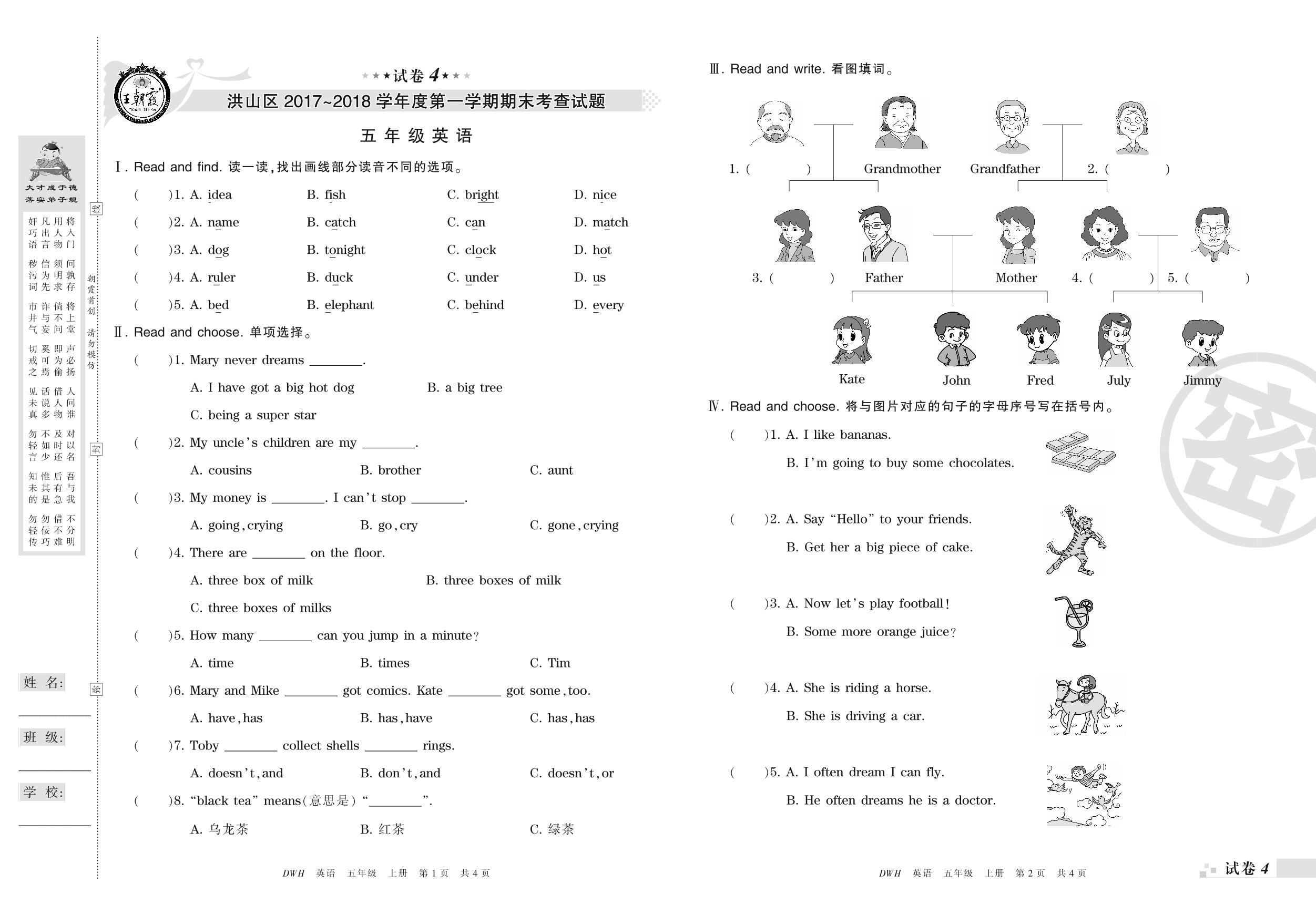 2017-2018学年第一学期武汉市洪山区五年级英语试卷(剑桥版)【4】