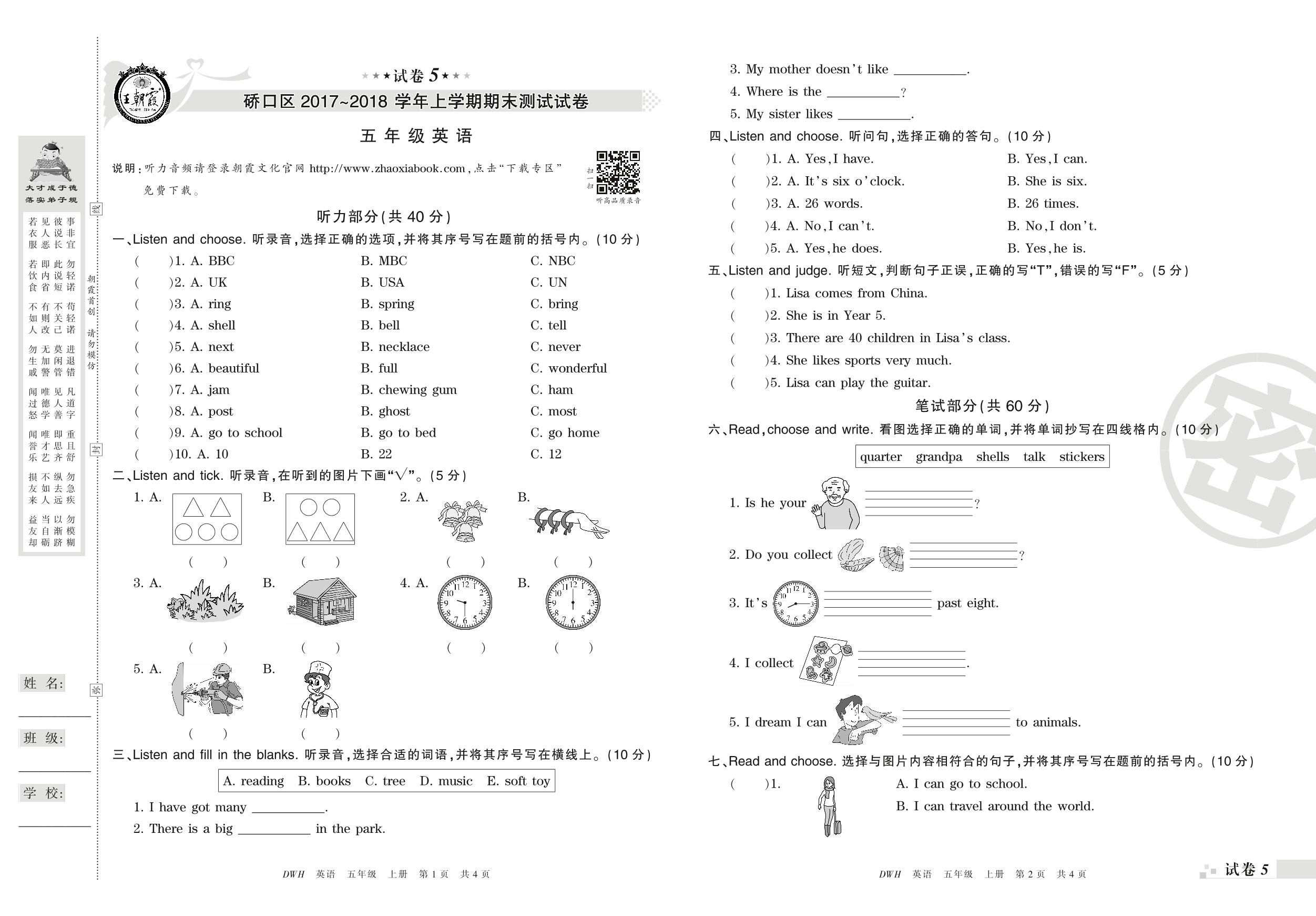 2017-2018学年第一学期武汉市硚口区五年级英语试卷(剑桥版)【5】