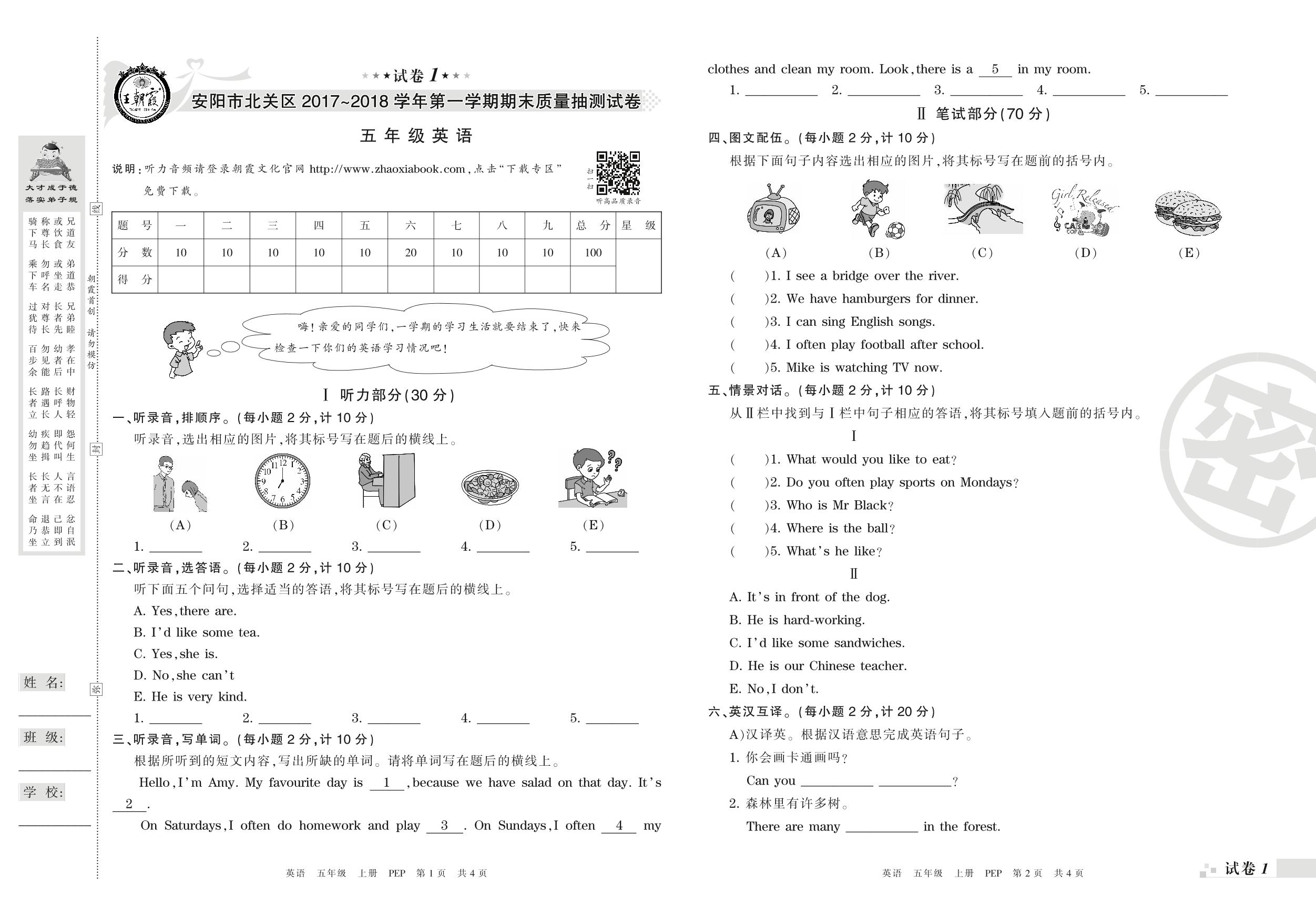 2017-2018学年第一学期安阳市北关区五年级英语试卷(PEP版)【1】