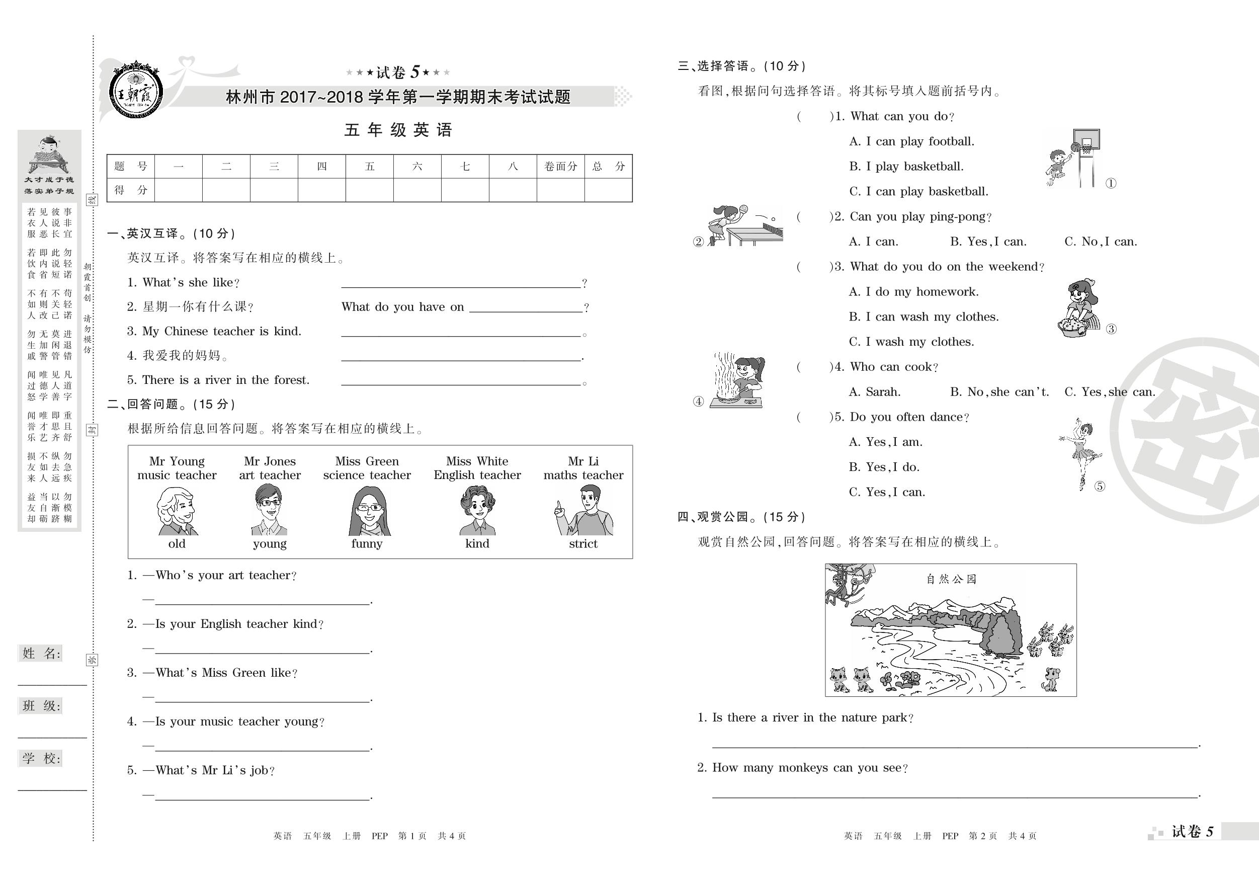 五年级英语人教PEP版(三起始)上册期末卷