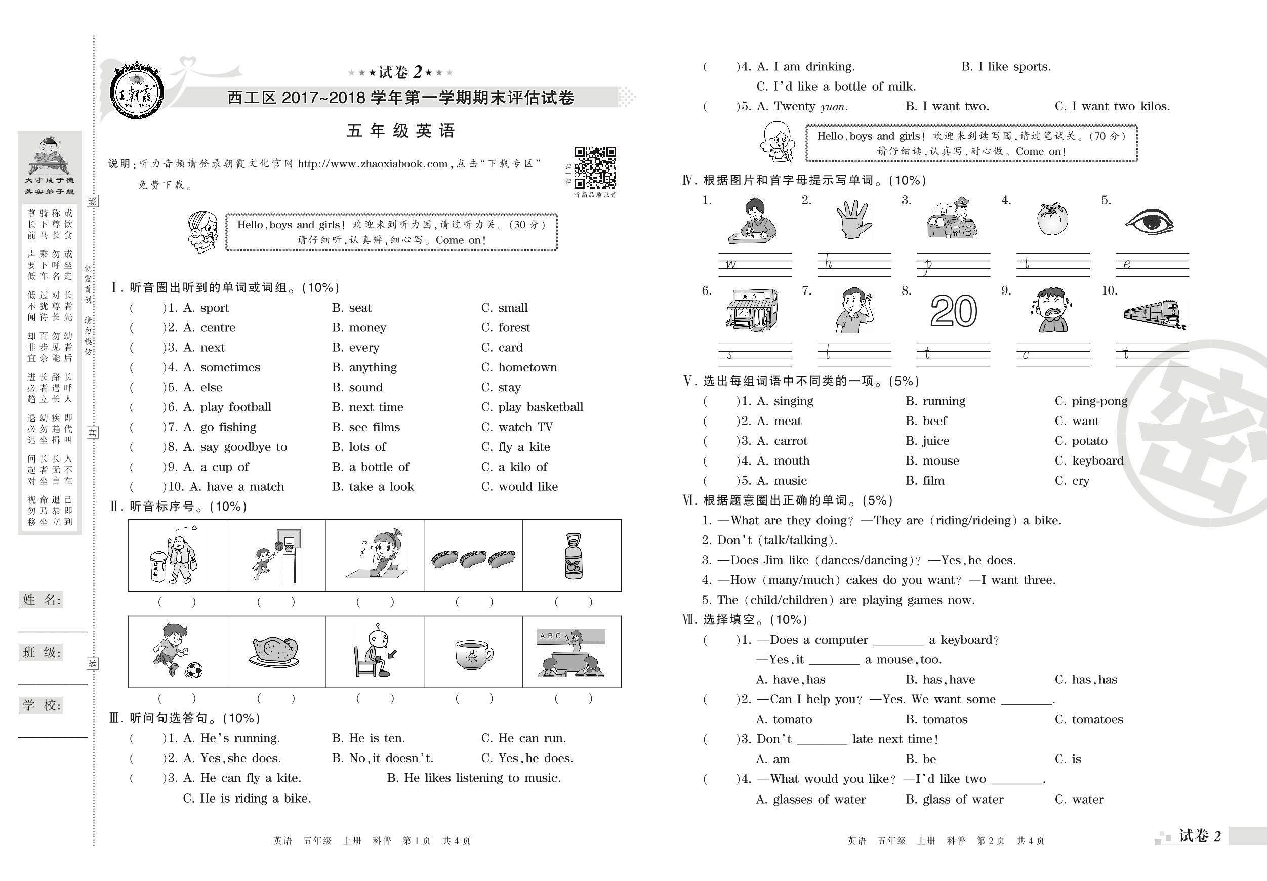 2017-2018学年第一学期洛阳市西工区五年级英语试卷(科普版)【2】