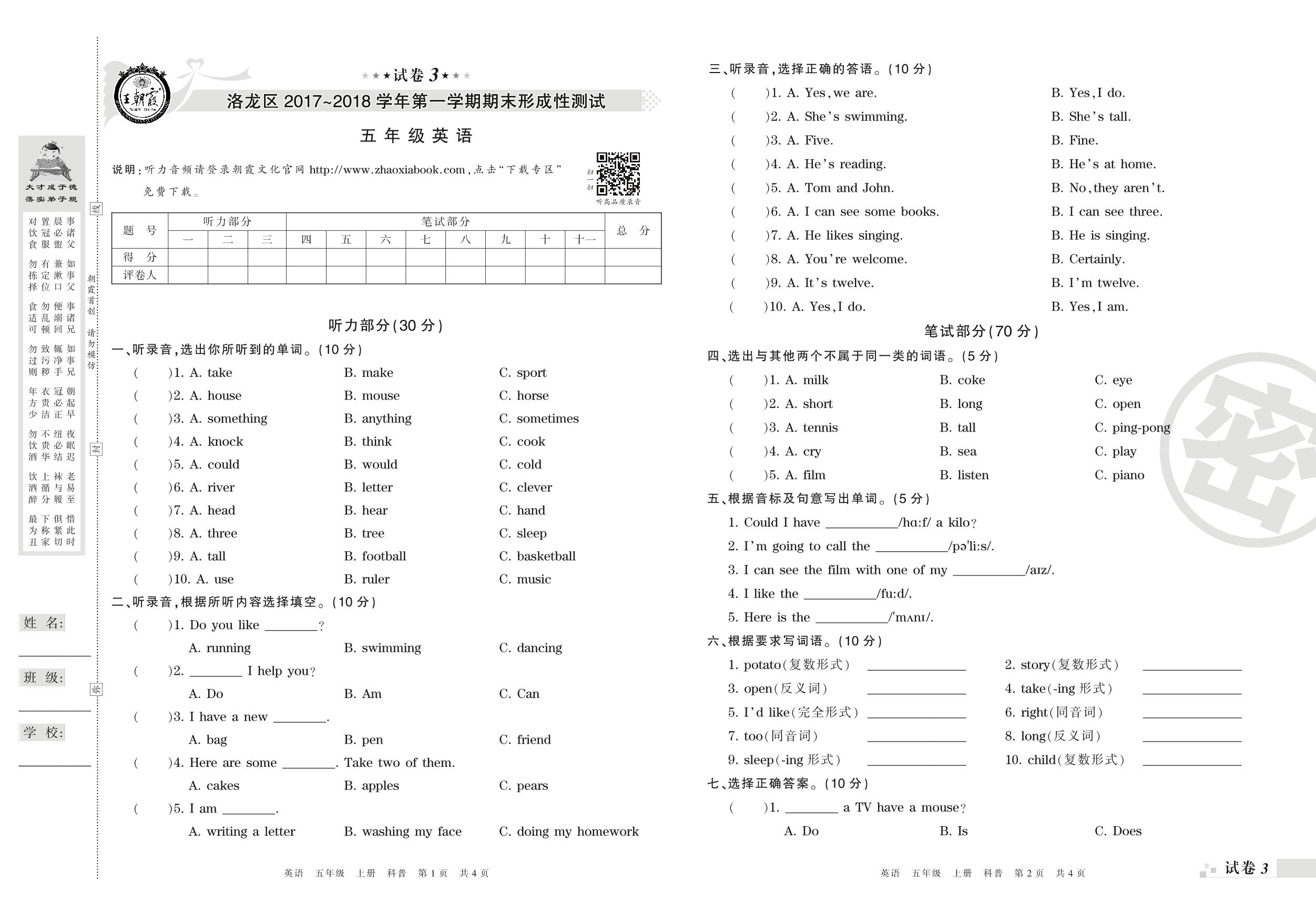 2017-2018学年第一学期洛阳市洛龙区五年级英语试卷(科普版)【3】