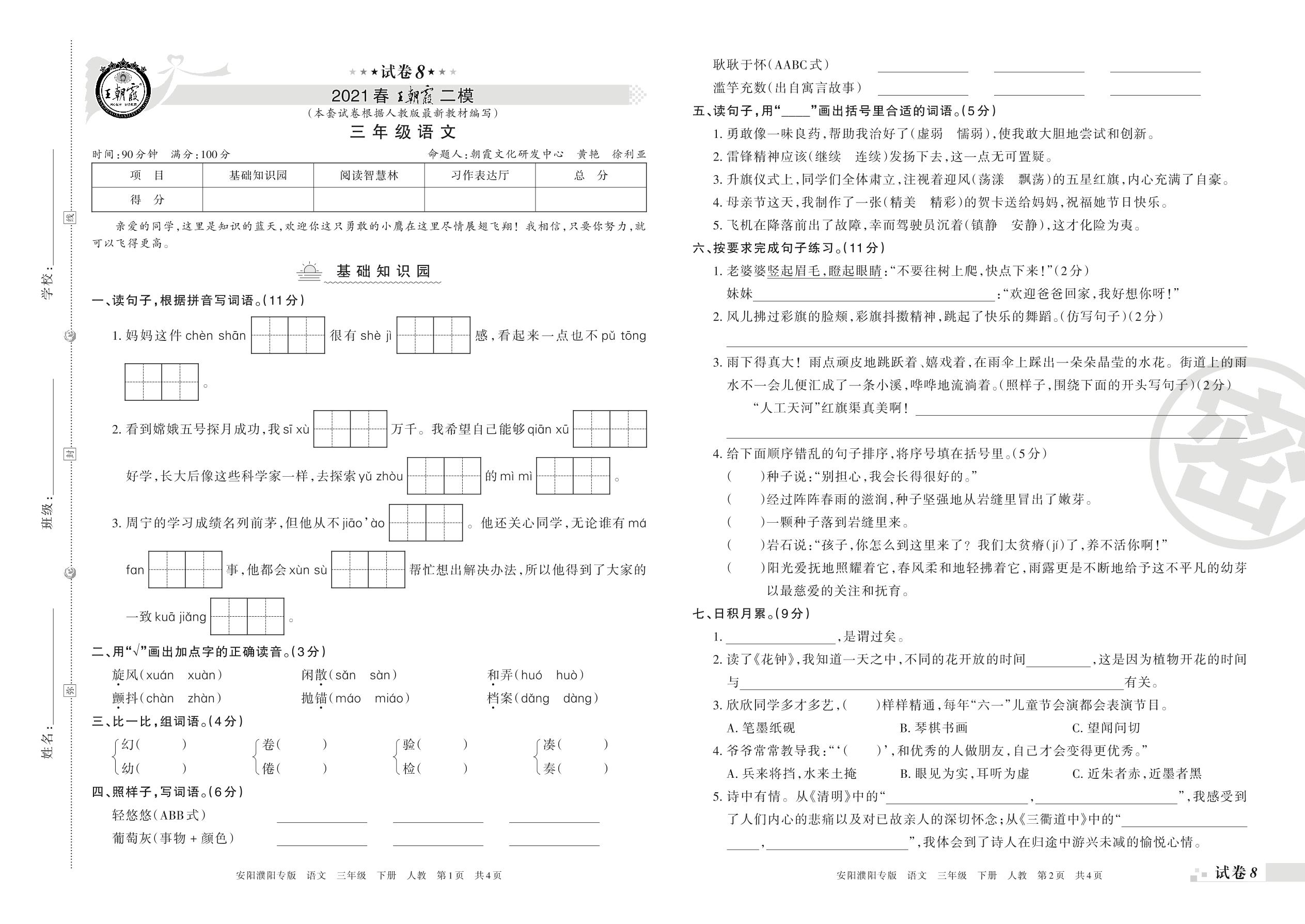 王朝霞期末模拟卷三年级下册语文(人教版)_R21080183357【8】