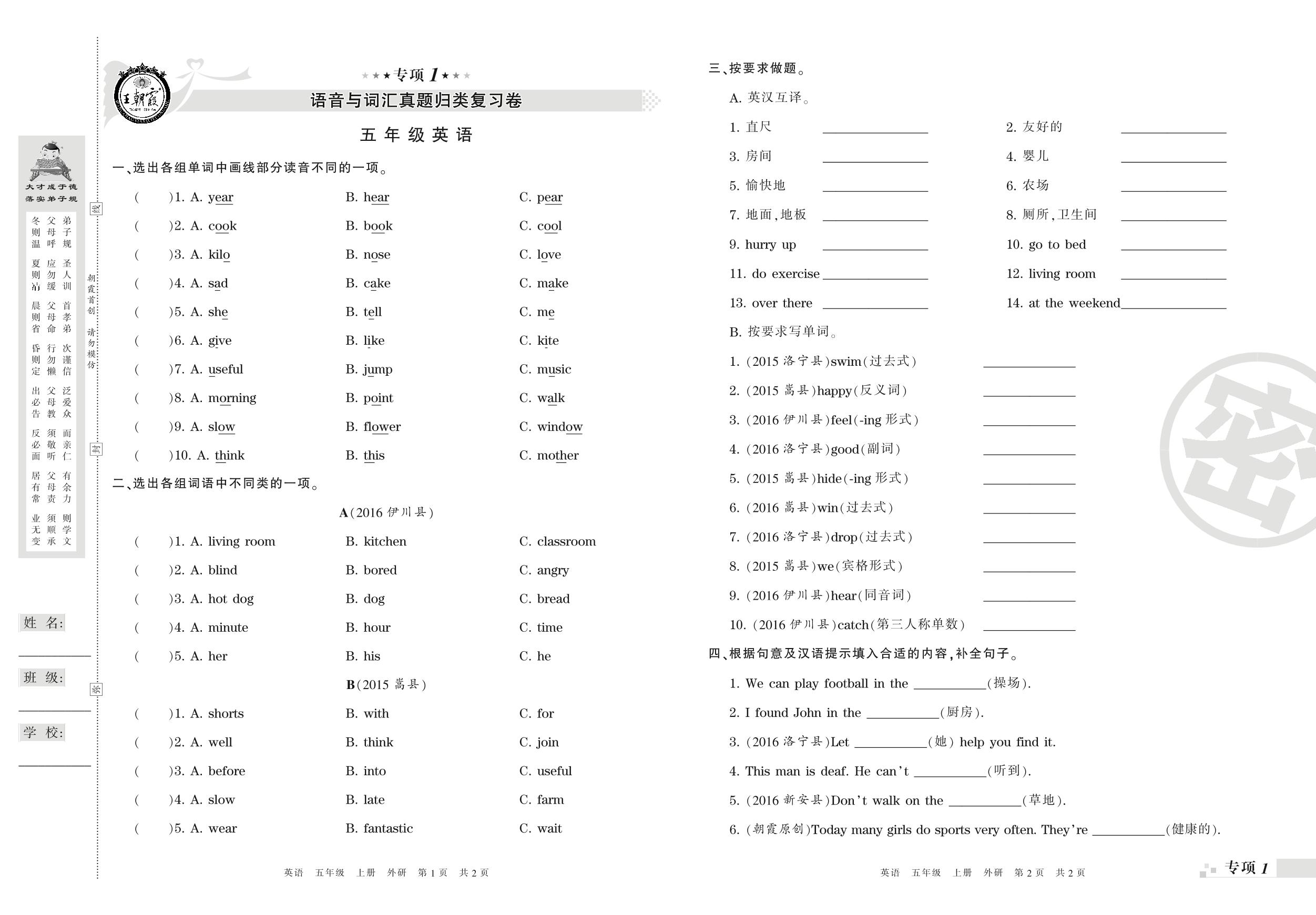 王朝霞期末专项卷——语音与词汇、句子真题归类复习五年级上册英语(外研版)_R210807152556【0】