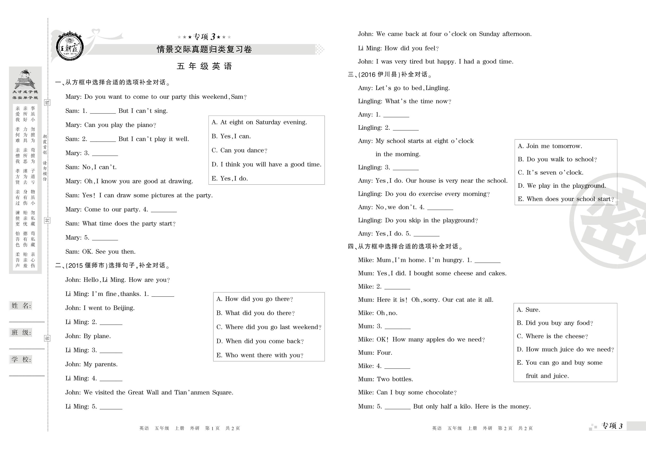 王朝霞期末专项卷——情景交际、阅读理解真题归类复习五年级上册英语(外研版)_R210807152558【0】